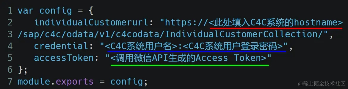 我们需要在nodejs实现的微信消息服务器里调用SAP C4C OData API,因此需要在nodejs应用里指定C4C OData API的endpoint. 创建一个config.js文件,实现config module: