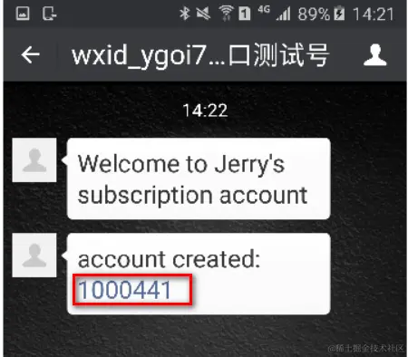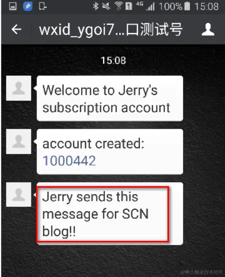 在微信app上收到了一条微信消息服务器发送的提示关注成功的自定义消息: