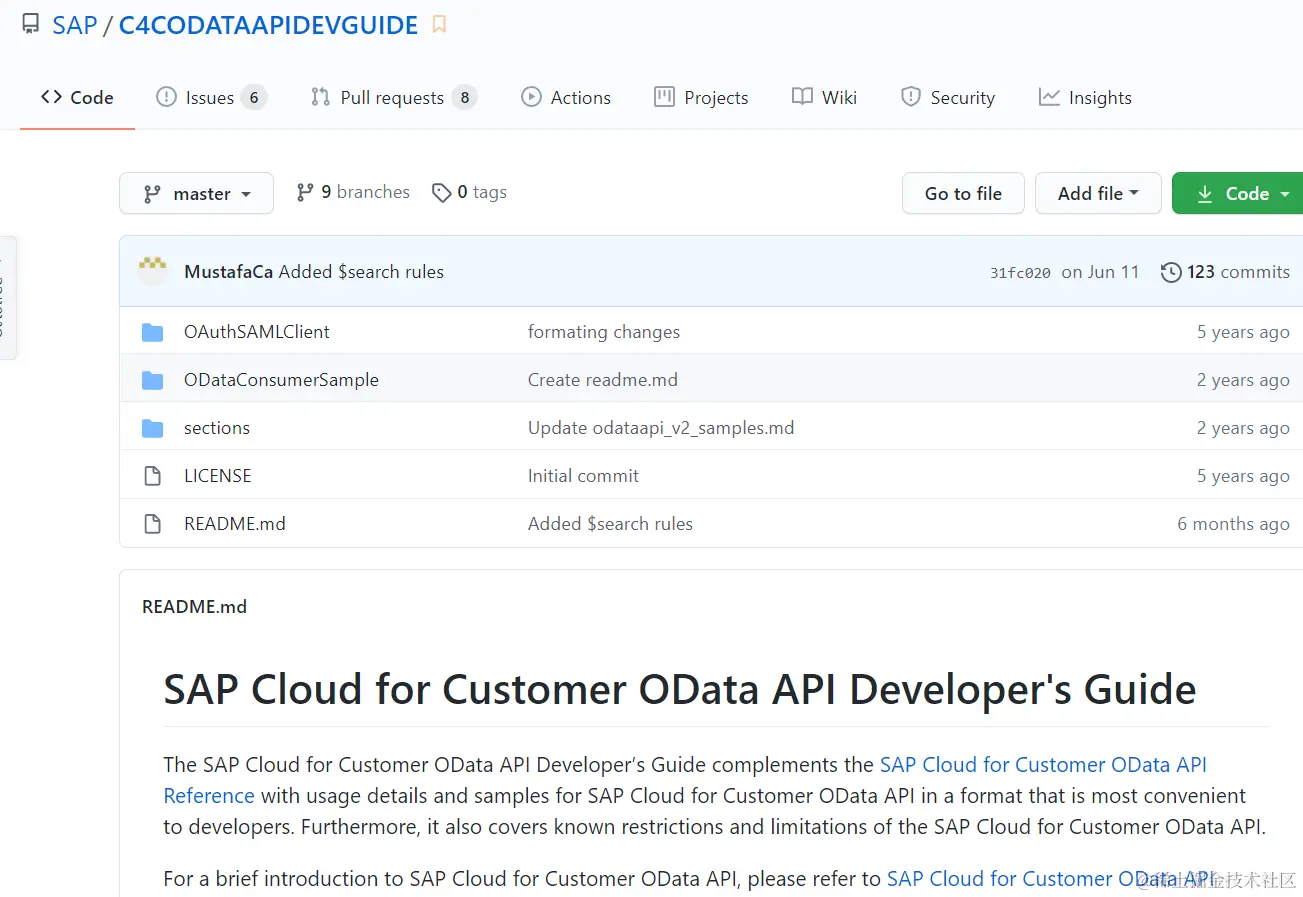 第二行创建C4C客户主数据的OData url,可以在SAP官方github的C4C OData开发指南仓库里找到,链接如下。