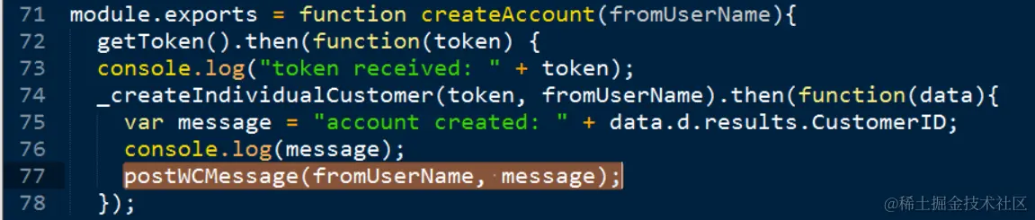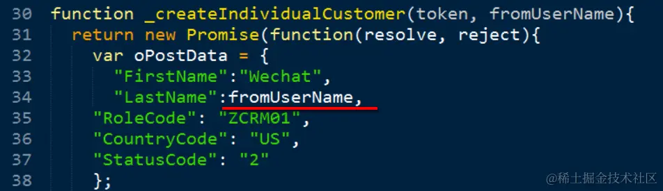 第20行的变量fromUserName,储存的是包含在HTTP POST请求里的关注者Wechat ID. 后续微信消息服务器主动给关注者推送C4C客户主数据创建成功的消息时,调用微信消息推送API,会用到这个Wechat ID.