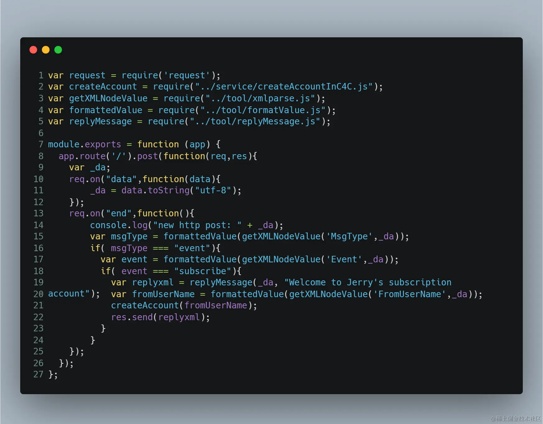 其中第18行,如果event变量值为subscribe,说明用户点击了“关注”按钮,进入对应的if分支处理。