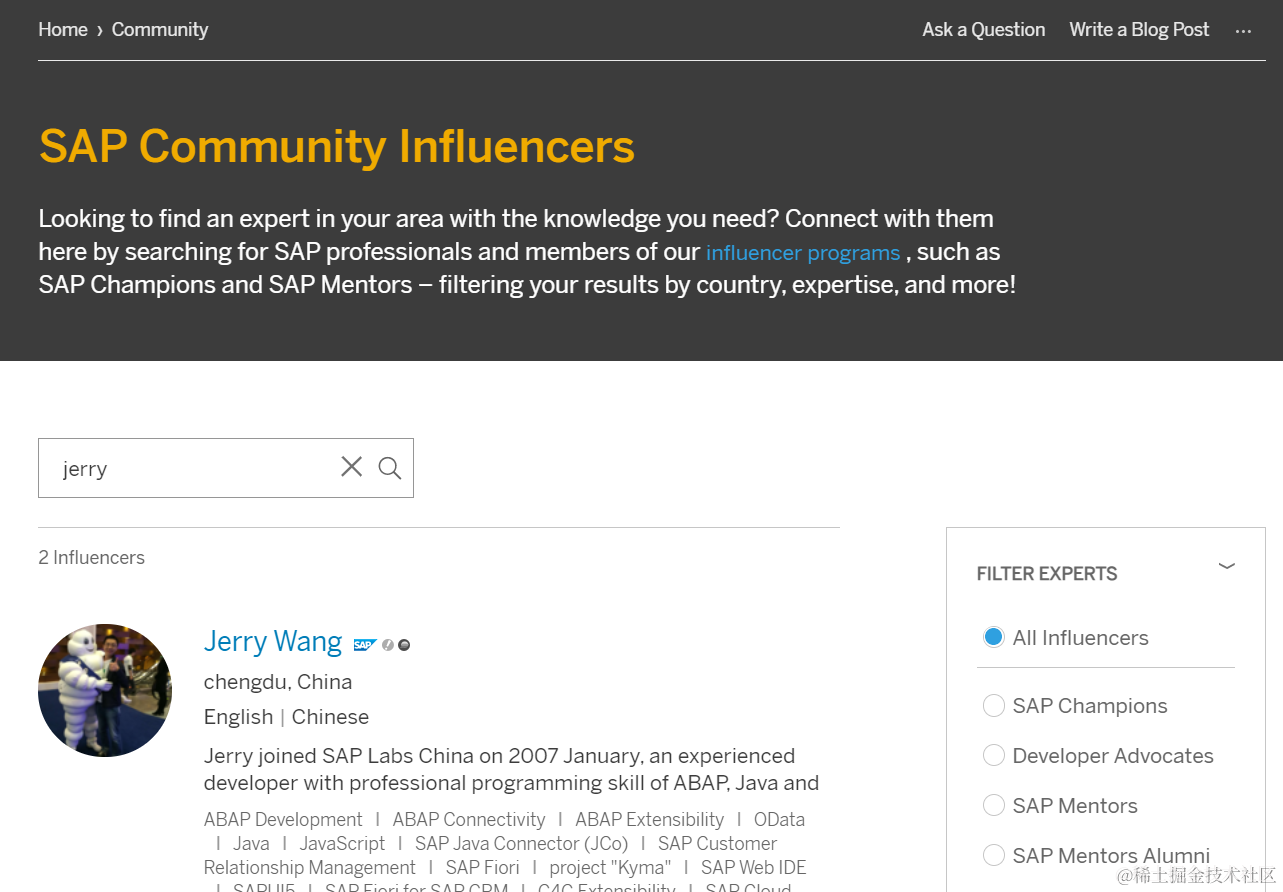 我是SAP成都研究院的开发人员Jerry Wang,我于2007年1月加入SAP成都研究院工作至今,一直从事开发岗位的工作。我是SAP Community Mentor和Technology Ambassador: