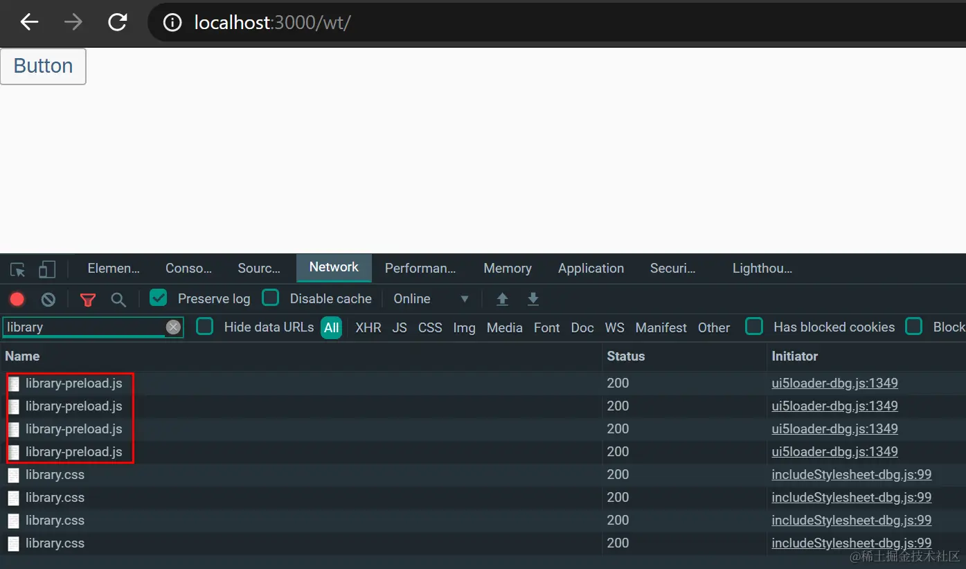上图是按照Jerry文章一个用于SAP UI5学习的脚手架应用,没有任何后台API的依赖里介绍的方法,开发了一个只包含button控件的最简单的SAP UI5应用,加载之后在Chrome开发者工具里观察到的网络请求,其中包含四个library-preload.js的加载: