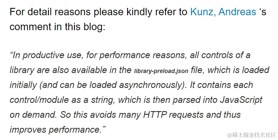 在productive使用场景下,处于性能考虑,一个SAP UI5应用的单个library里包含的所有控件实现会被打包成单个的文件library-preload.json中去,可以在SAP UI5应用bootstrap阶段加载或者按需进行异步加载。Library-preload.json以字符串的格式包含了每个control/module的实现,可以被解析成JavaScript对象在SAP UI5框架里使用。这种打包成单个库文件然后加载的方式,减少了HTTP请求的数量,提高了性能。