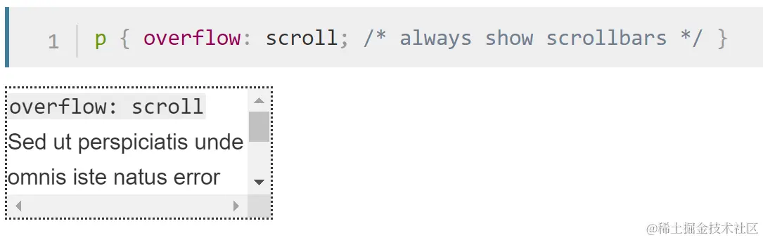 - scroll: 超过范围的区域,以scrollbars的方式上下移动显示,scrollbars总是显示