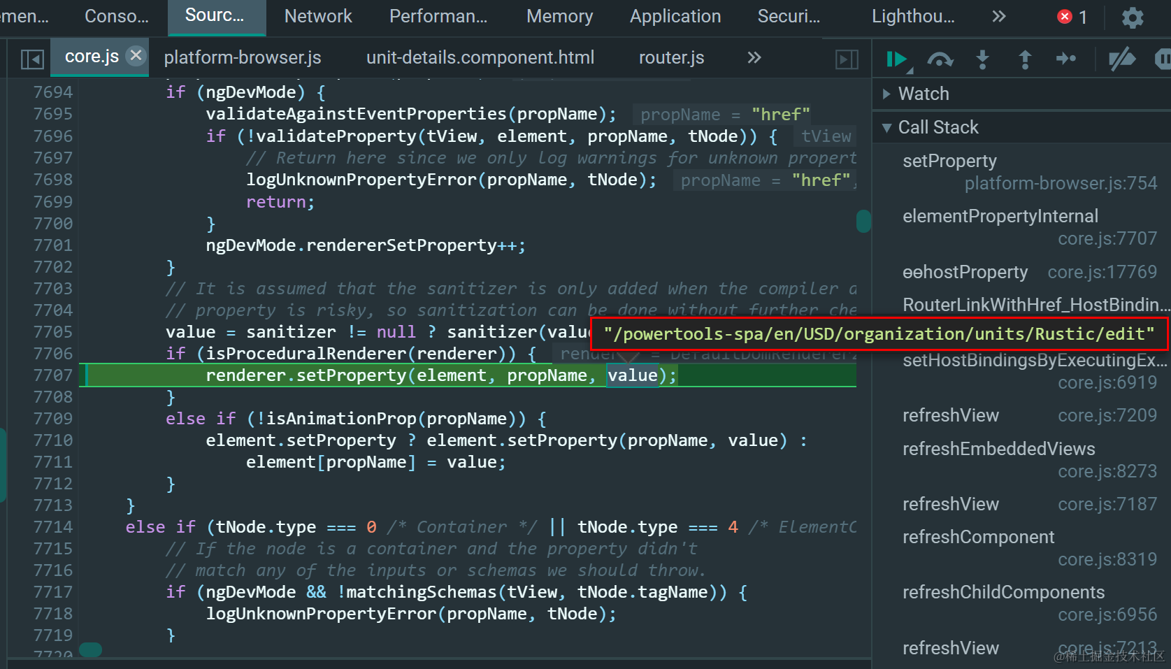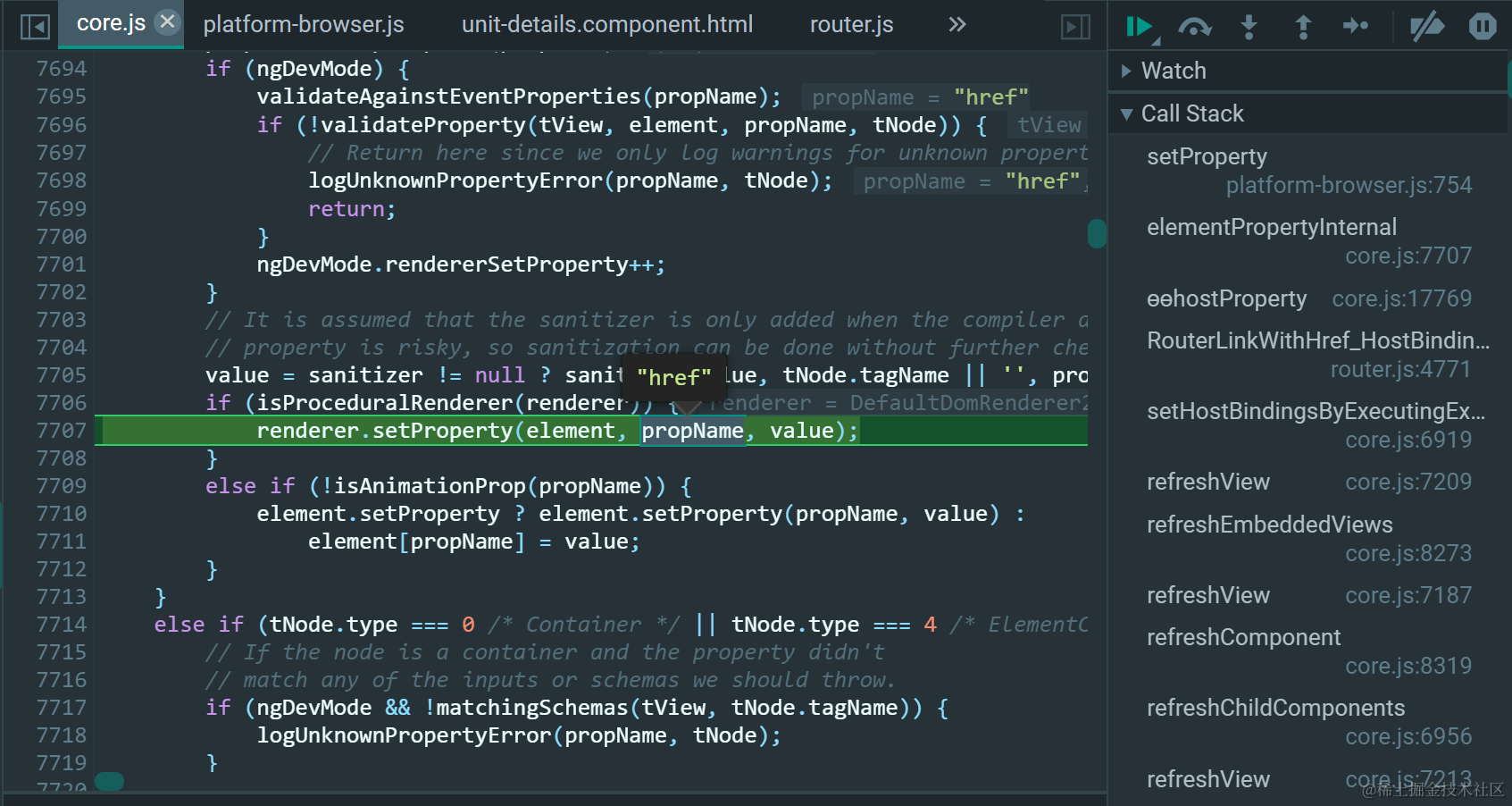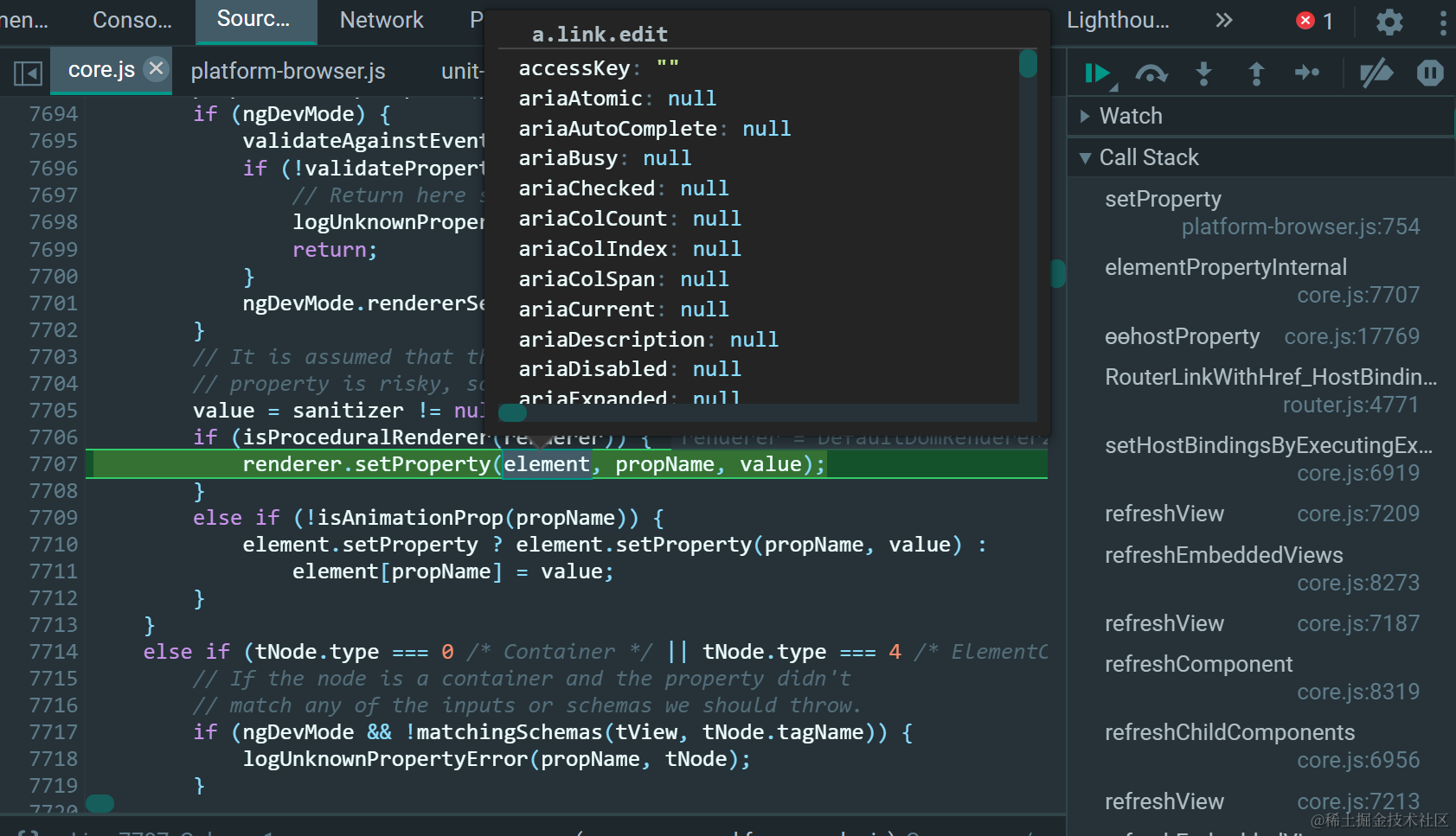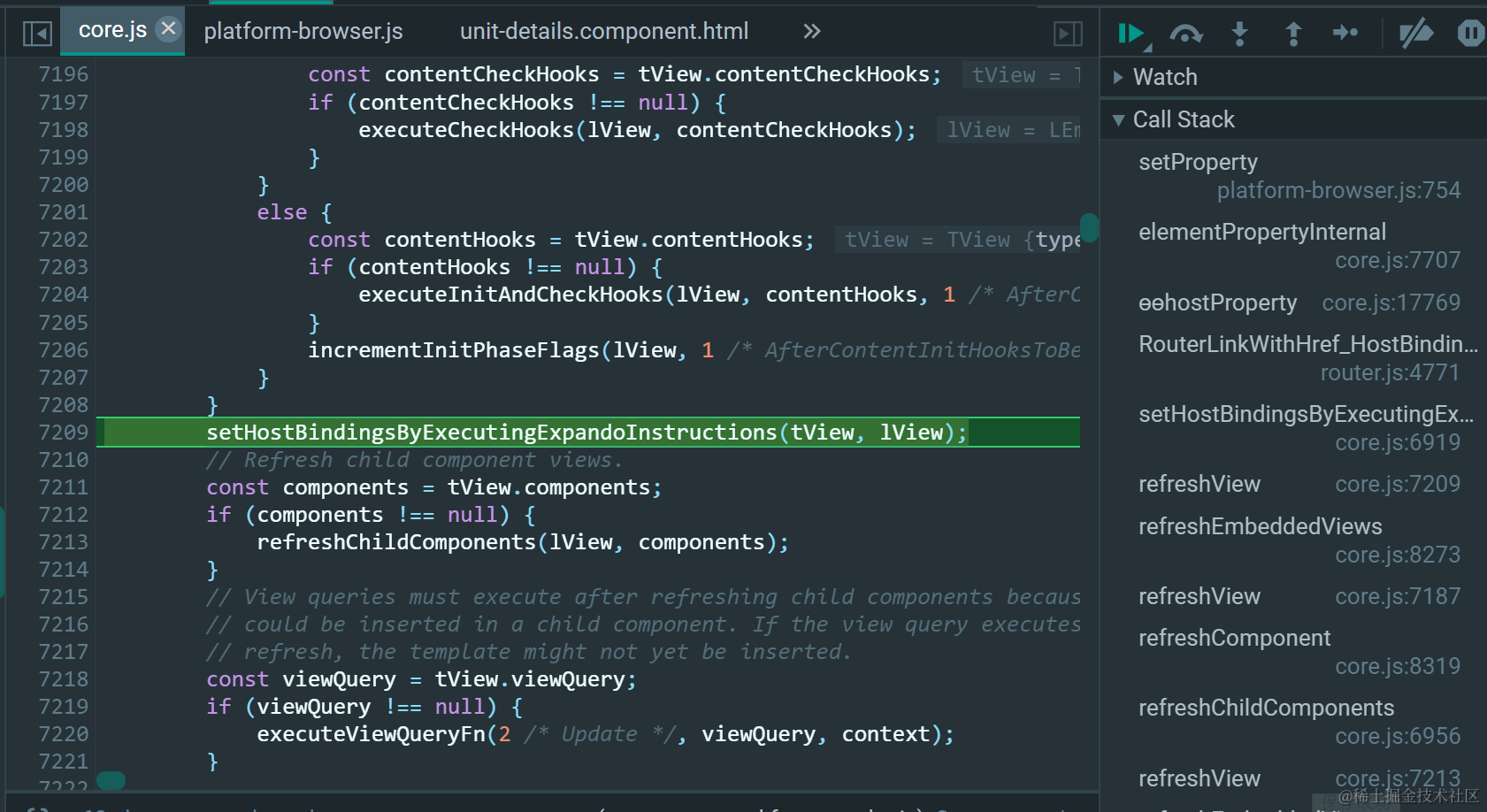 在core.js文件的setHostBindingsByExecutingExpandoInstructions(tView, lView)函数里设置断点: