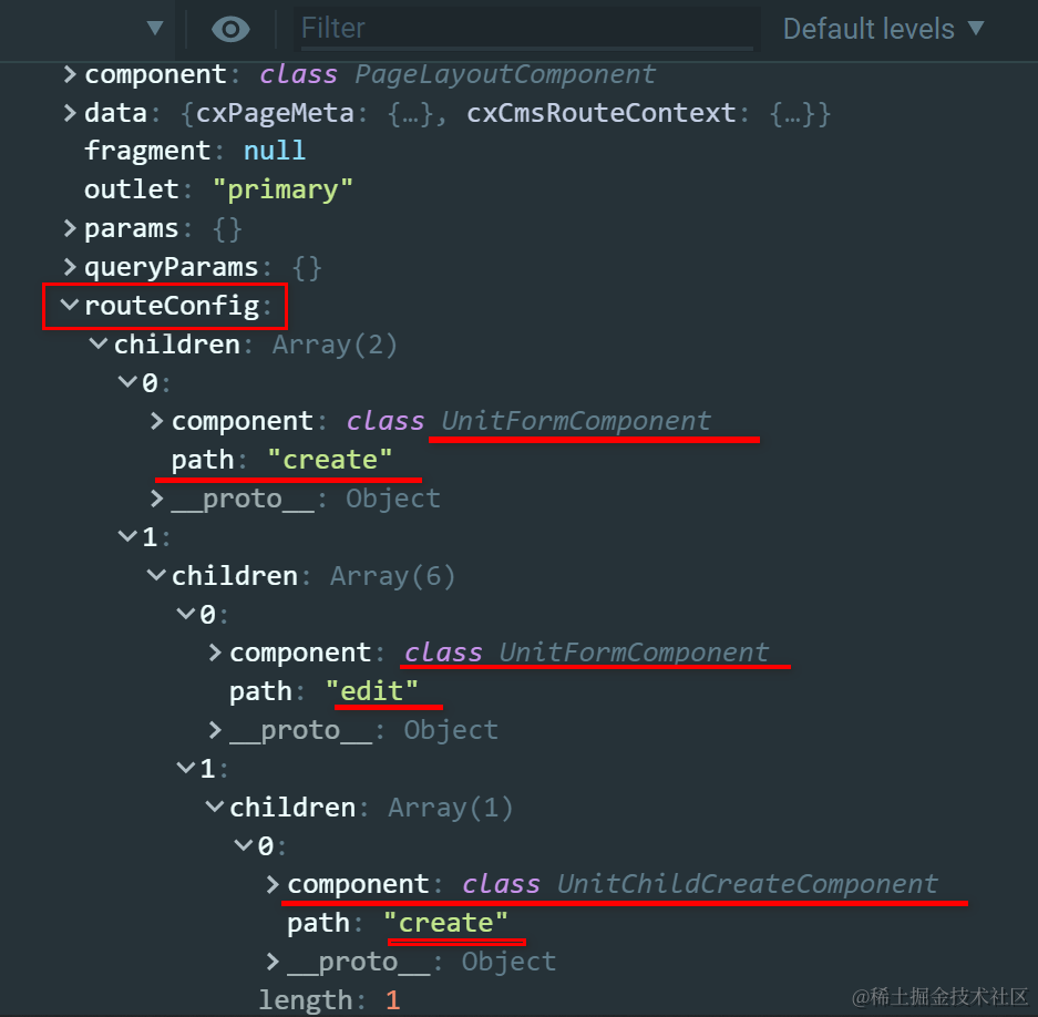 在routeConfig参数里,能看到每个路由路径的字符串,和对应应该打开的Angular Component: