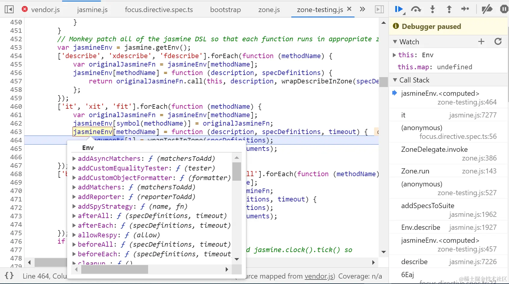 jasmineEnv变量是个巨大的对象,包含了很多jasmine测试方法的实现:
