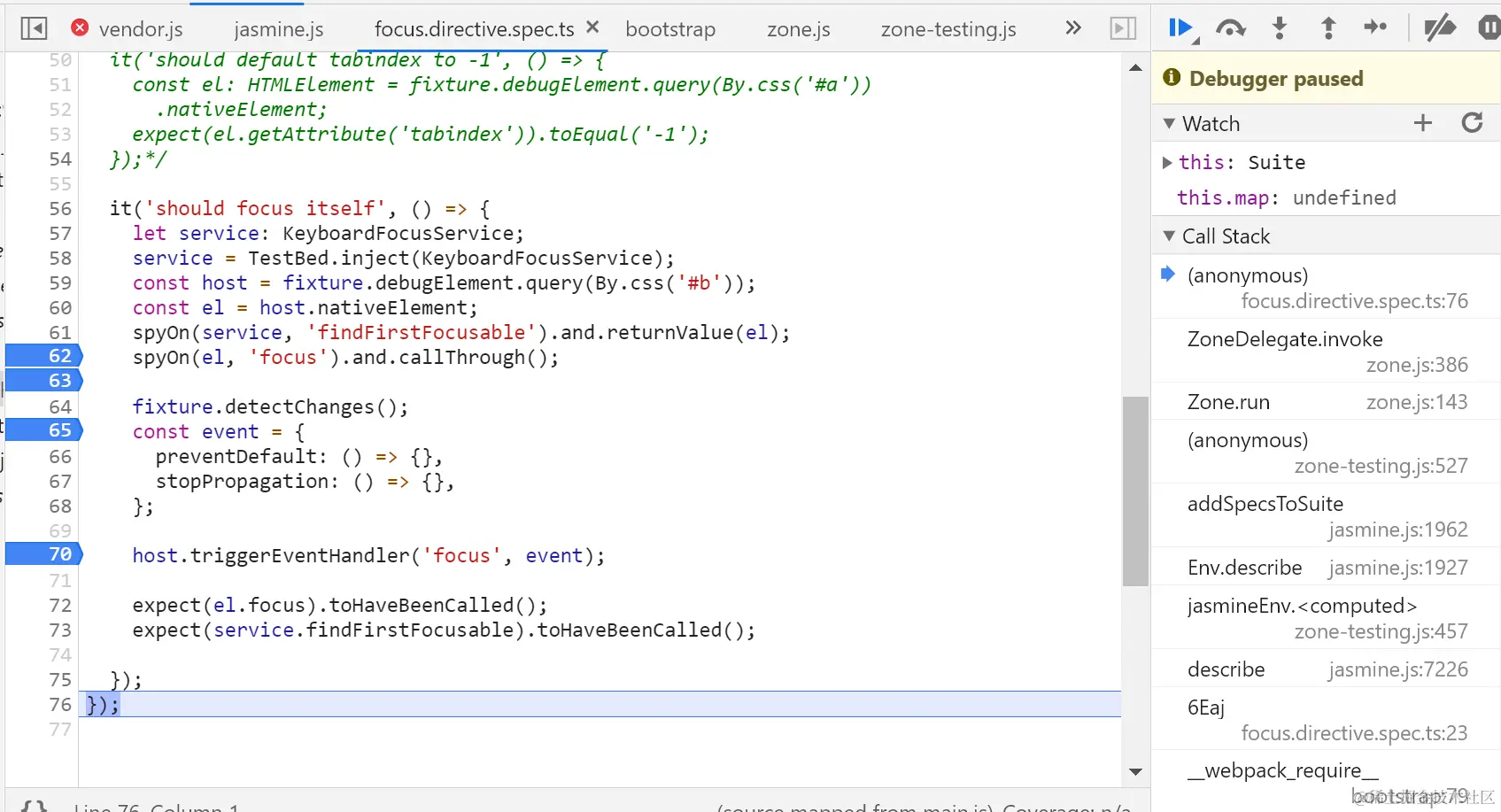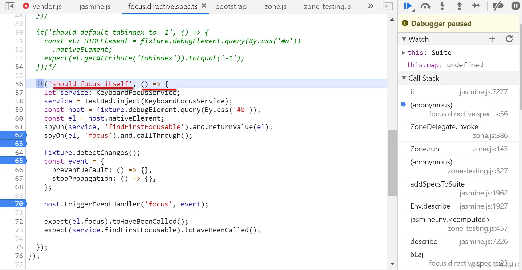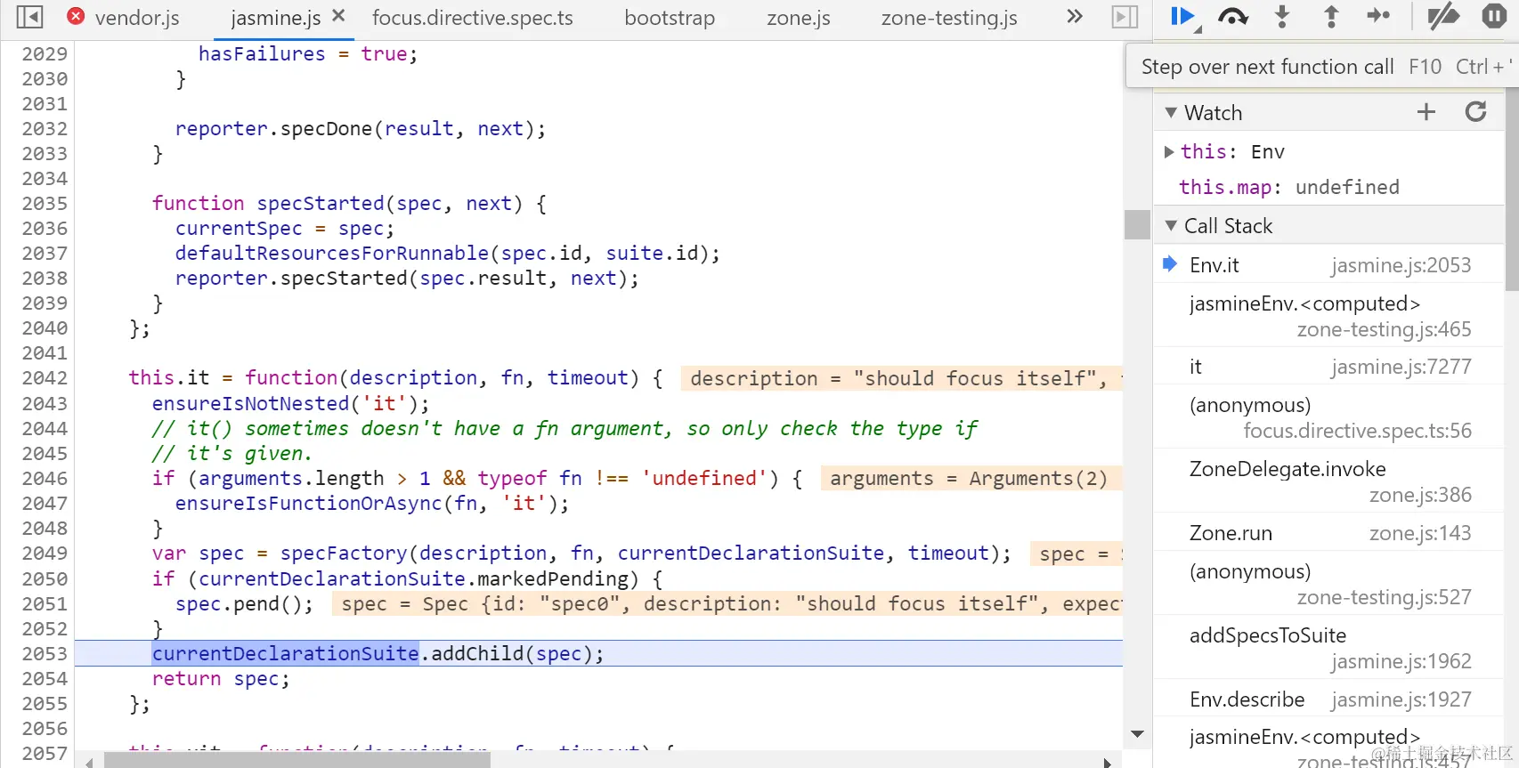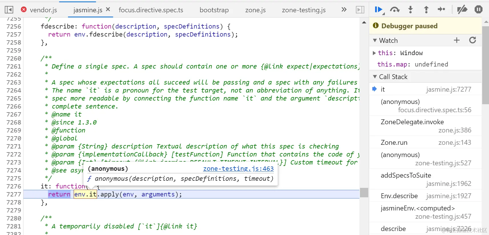 注意,此时只是将it函数传入的待测试代码即箭头函数,包裹成jasmine test spec,但还未真正开始执行。