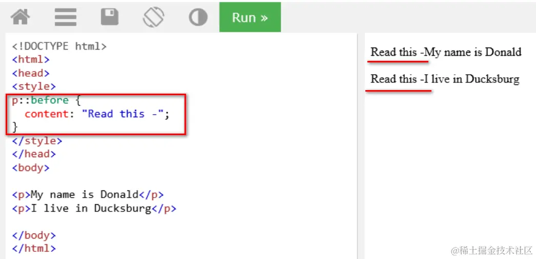 ::before选择器的用法,通过下面这个简单的例子可以学会——在施加了::before选择器的HTML元素前部,会自动出现选择器content属性指定的内容。