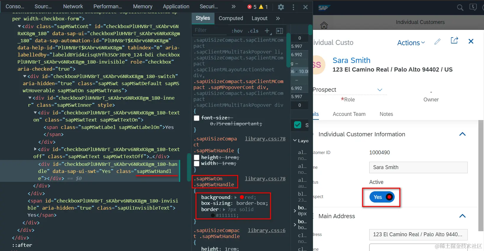 这个效果并未像SAP CRM那样采取::before实现,而是通过给一个div标签同时添加sapMSwtOn和sapMSwtHandle这两个类实现的,handle的字面意思即抽屉的把手。