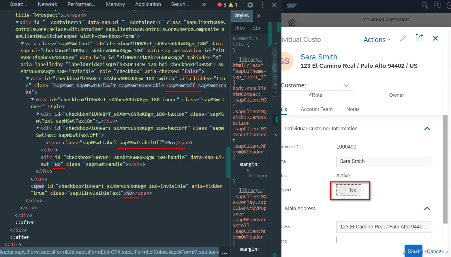 C4C的Checkbox处于未选中状态时,wrapper div的aria-checked属性值为false, 内层div被赋予css类sapMSwtOff,span节点的值为No: