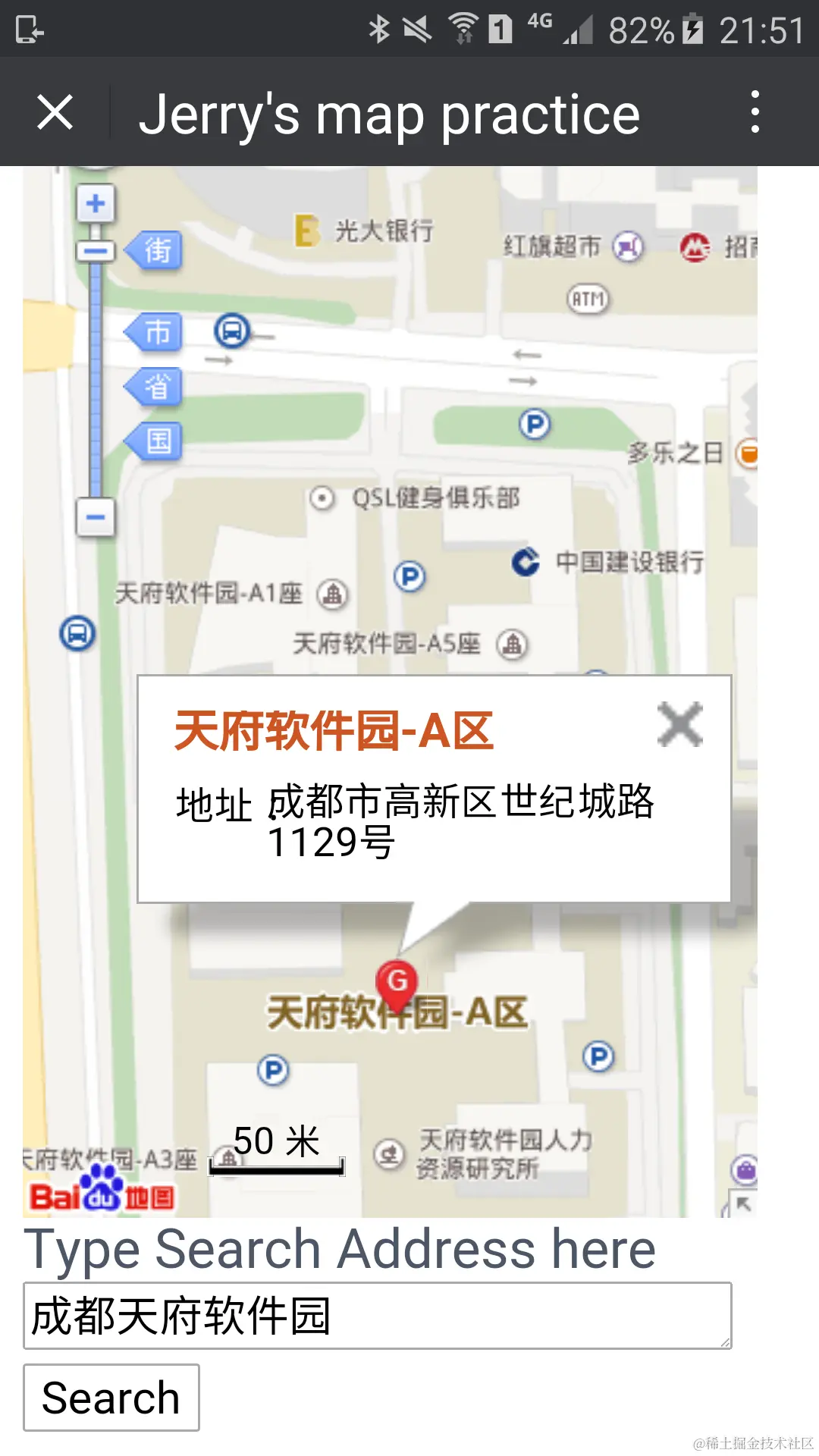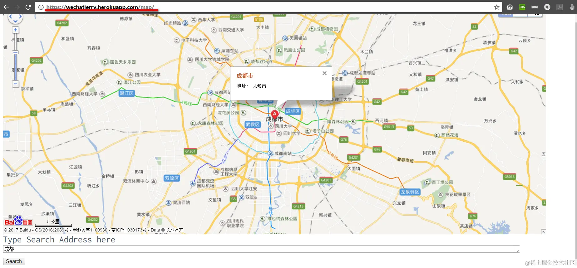 这个地图搜索的功能使用起来很简单,在微信公众号里通过菜单打开我剥离之后,纯HTML/JavaScript实现的百度地图的搜索界面后,在input字段里输入地址,然后点Search按钮,即可自动定位到目的地址。