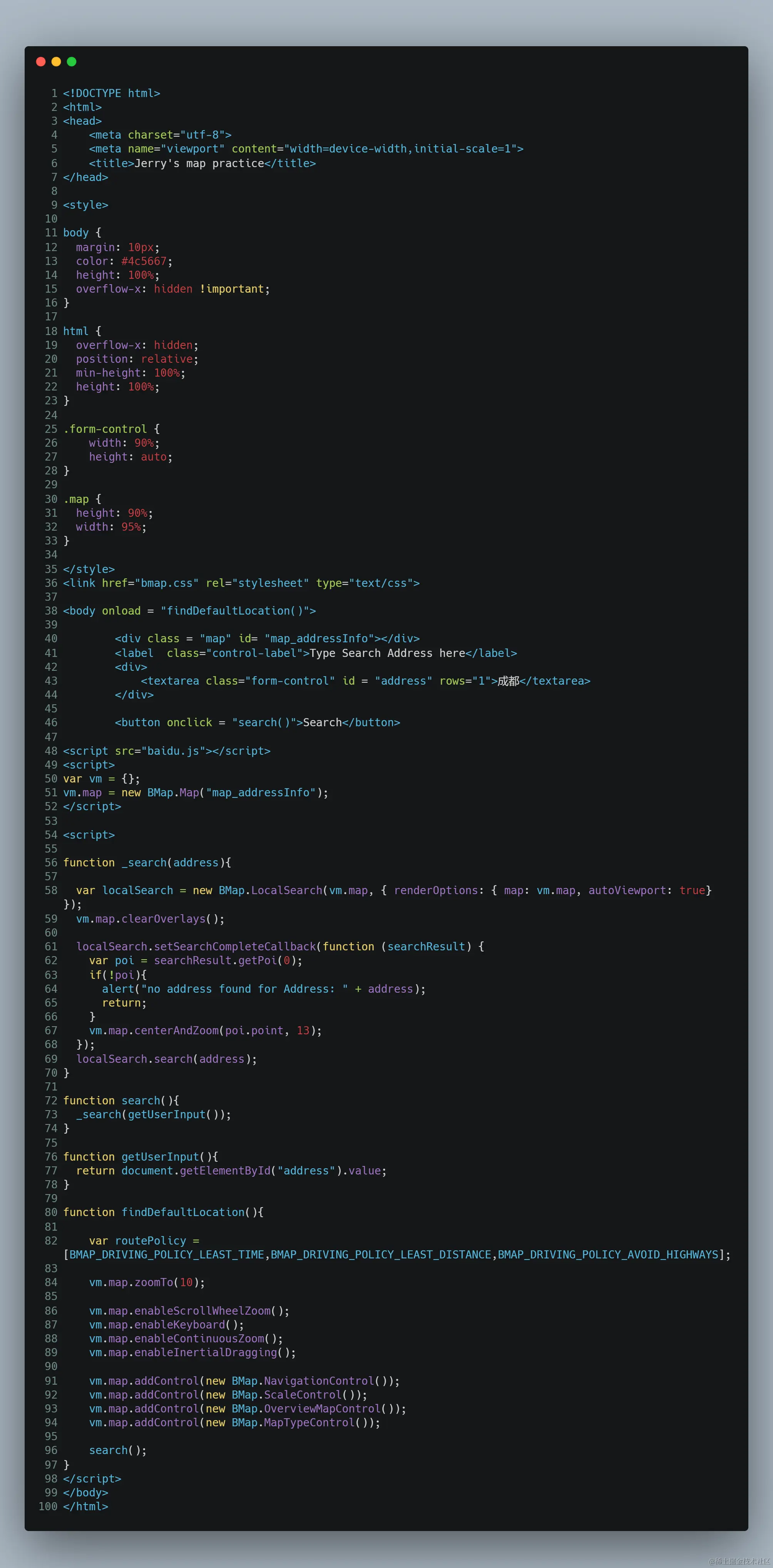 我的这个地图搜索网页应用只需要实现唯一的一个index.html,源代码刚好100行: