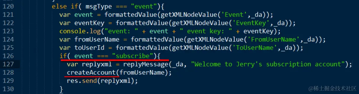 在微信消息服务器的事件处理函数里,一旦接收到“关注”事件( 事件类型值:subscribe)时,调用createAccount函数,完成上述三个步骤: