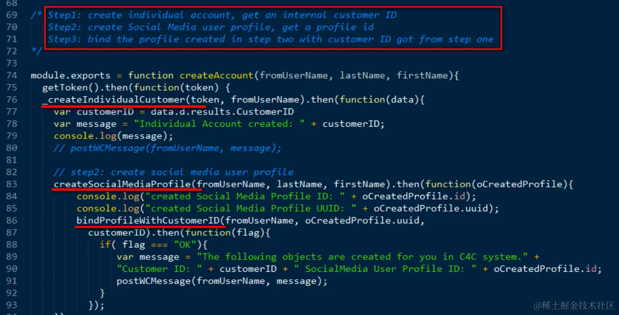 在createAccountInC4C.js的实现里,这三步按顺序实现在函数createAccount里: