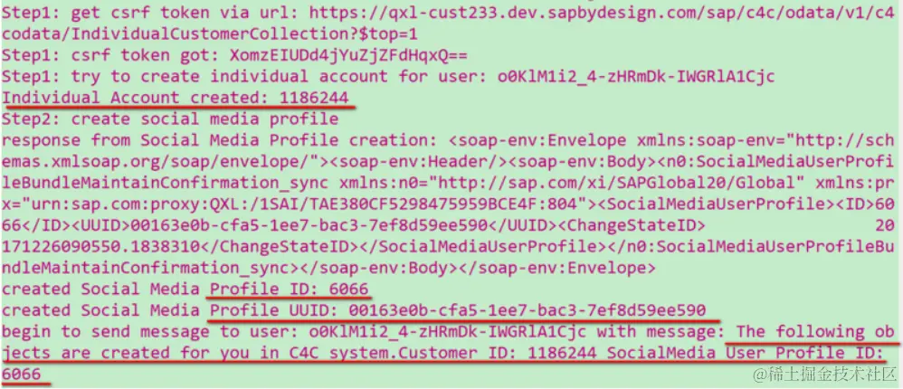 这些成功创建的C4C数据的ID,在微信消息服务器,即nodejs应用的控制台上也能观察到: