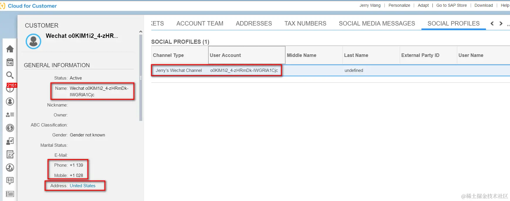 根据返回给微信用户的客户主数据ID,到C4C系统找到该主数据,在其Social Profiles面板里,能看到该Social Profile的渠道类型(Channel Type)为自定义的Jerry’s Wechat Channel: