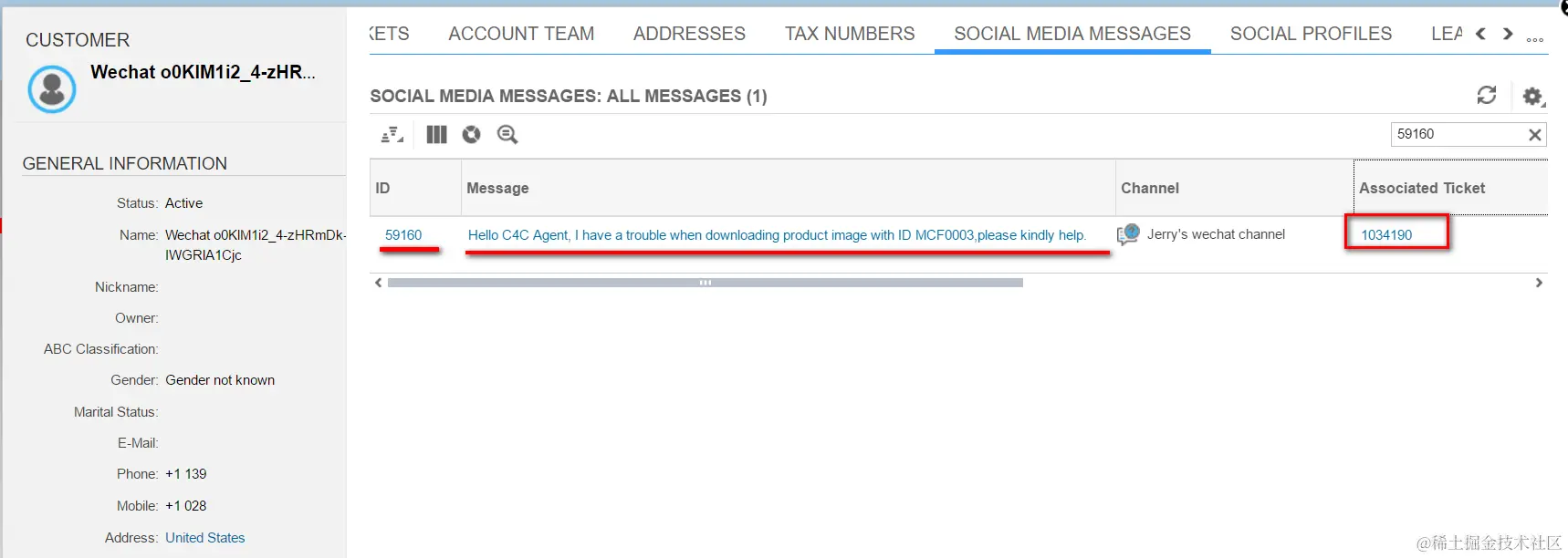下图是一个例子:我发送一条"Hello C4C Agent …"的文本信息,在SAP C4C系统创建的Social Media Message ID为59610: