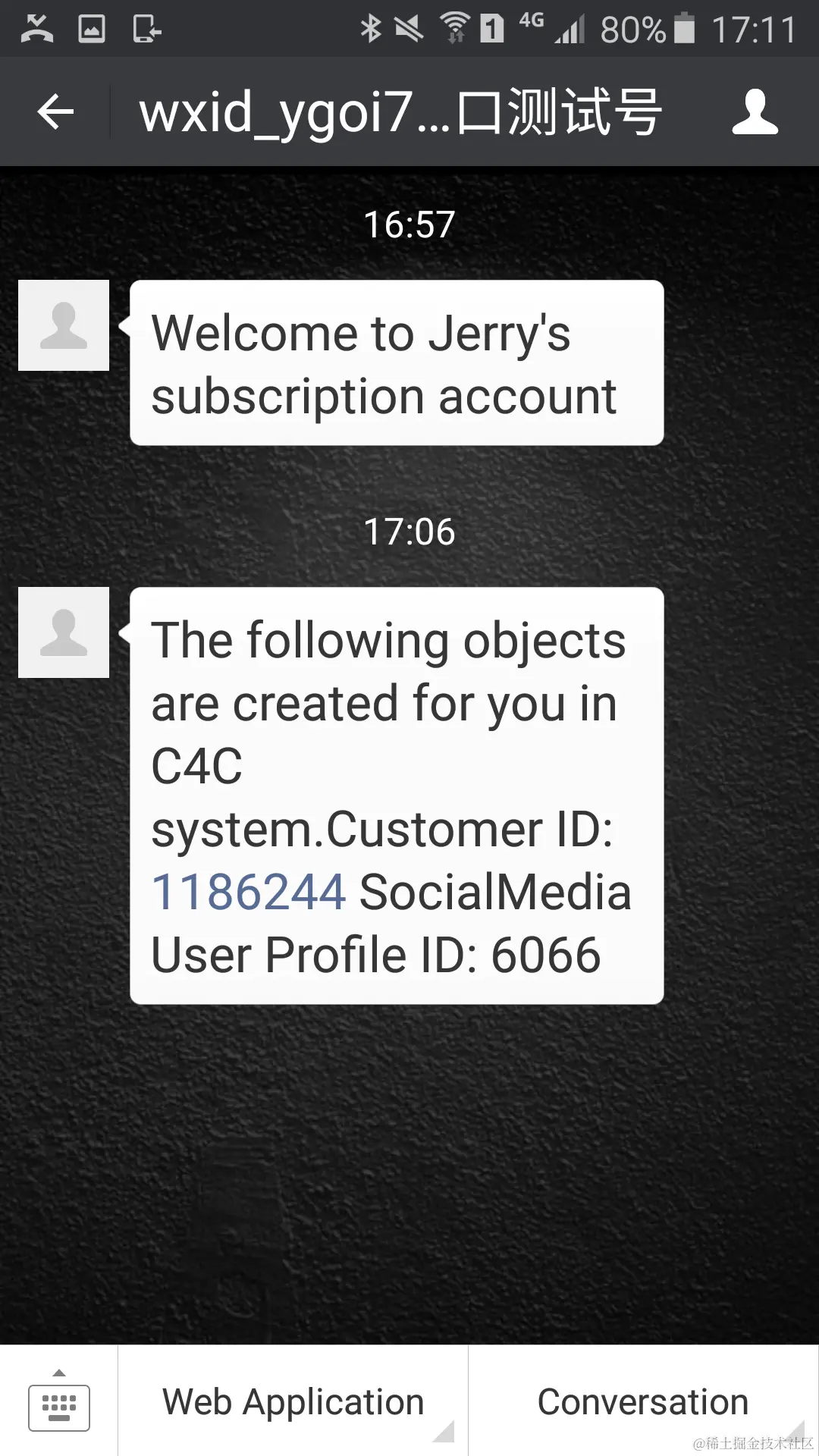 一旦微信用户给微信公众号发送文本信息,该文本信息通过微信公众号的消息服务器作为中转,调用C4C API,在C4C系统创建一条内容为该文本信息的Social Media Message数据。