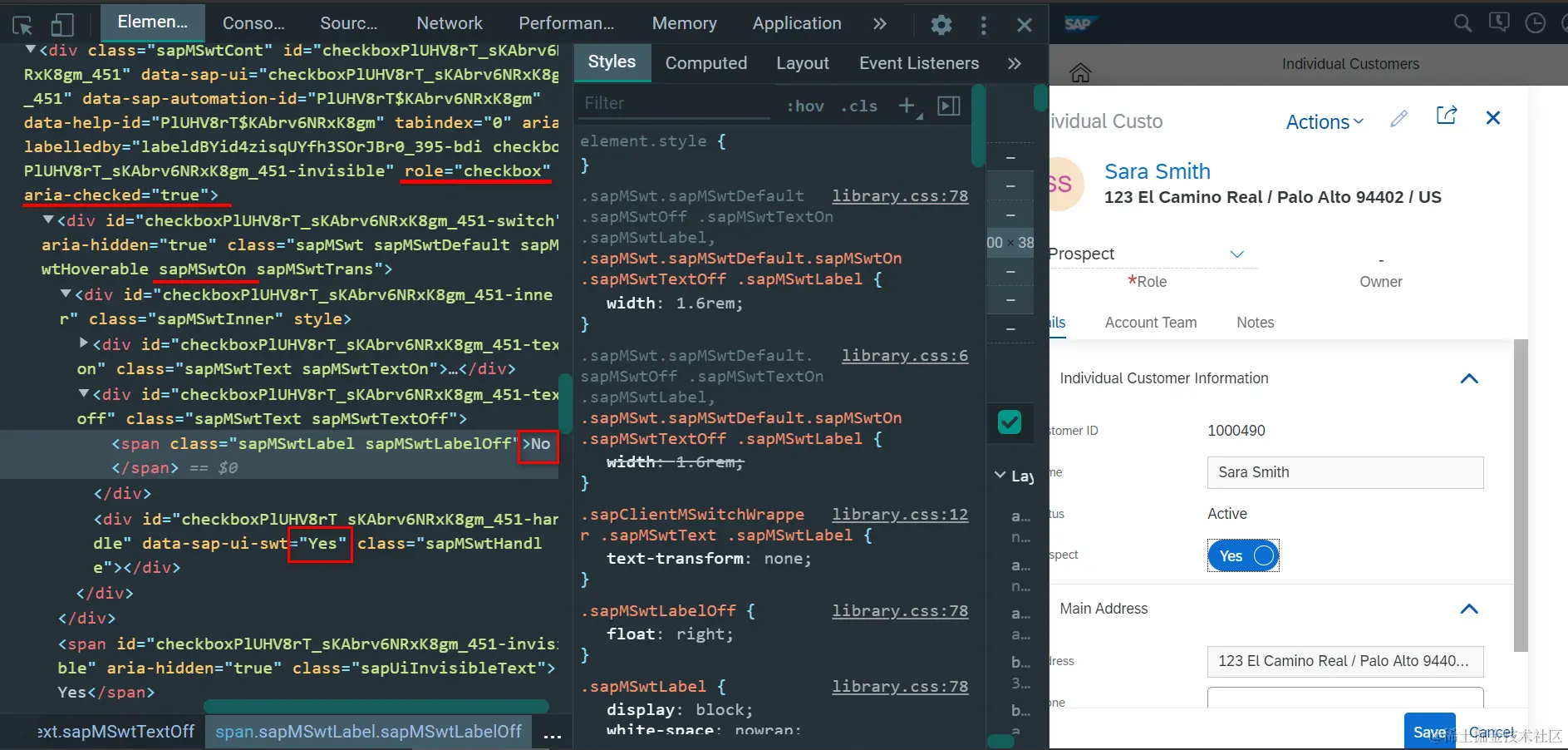 当Checkbox里的勾选中时,最外层的wrapper div标签的class变为th-sapcb-chkd,chkd是checked的缩写。 内层a标签属性值aria-checked设置为true.