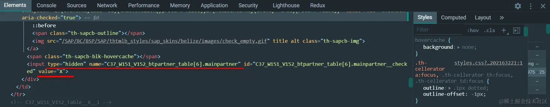 当Checkbox勾选时,上述介绍的最外层wrapper div的class变为th-sapcb-blk, blk意为blank; 内层a标签的aria-checked属性设置为false,hidden input的value属性值置空。