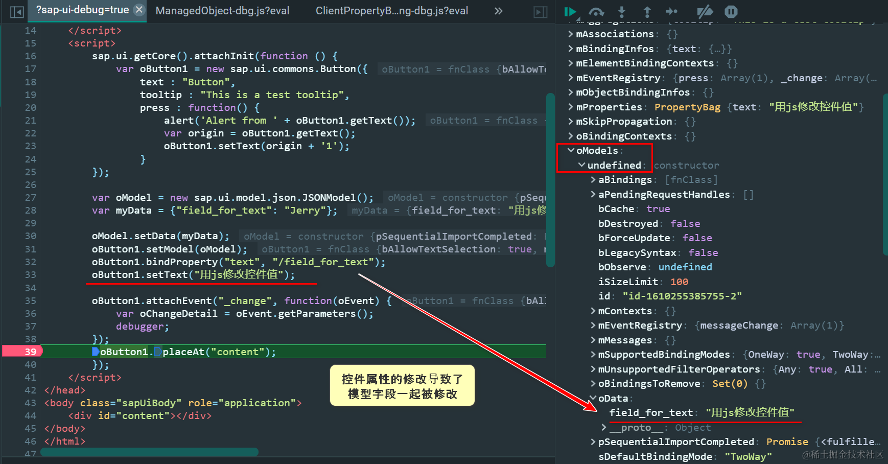 我们调用控件的setText方法,修改控件text属性。根据SAP UI5数据双向绑定特性,控件text属性绑定到的模型字段field_for_text的值,也会自动被修改: