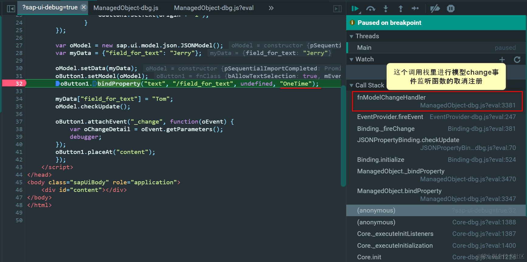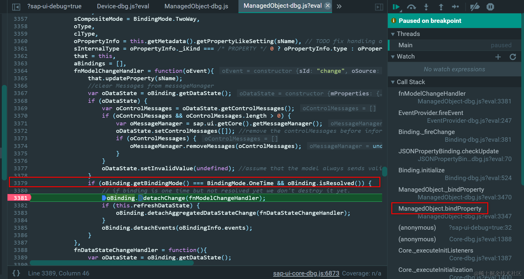 奥妙就在下图3379行代码的IF分支里:在SAP UI5控件调用bindProperty方法把控件属性绑定到模型字段时,如果当前绑定模式为OneTime,则取消控件针对模型change事件的监听函数注册。