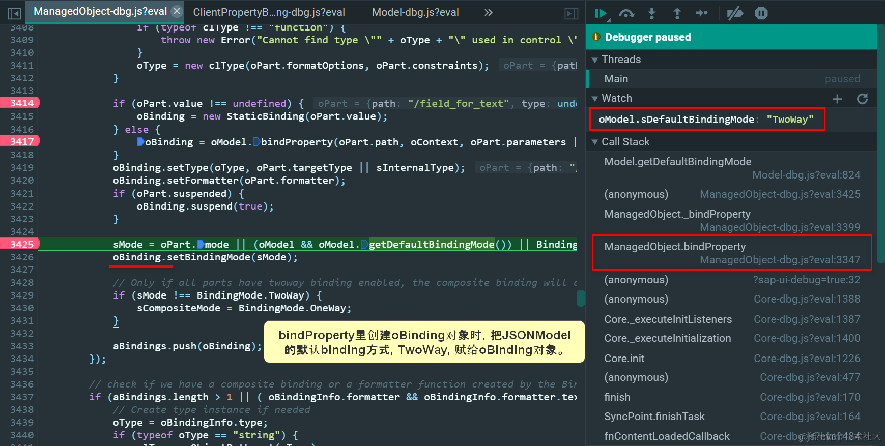 方法bindProperty里创建oBinding对象时,把JSONModel的默认binding方式(sDefaultBindingMode), TwoWay, 赋给oBinding对象。