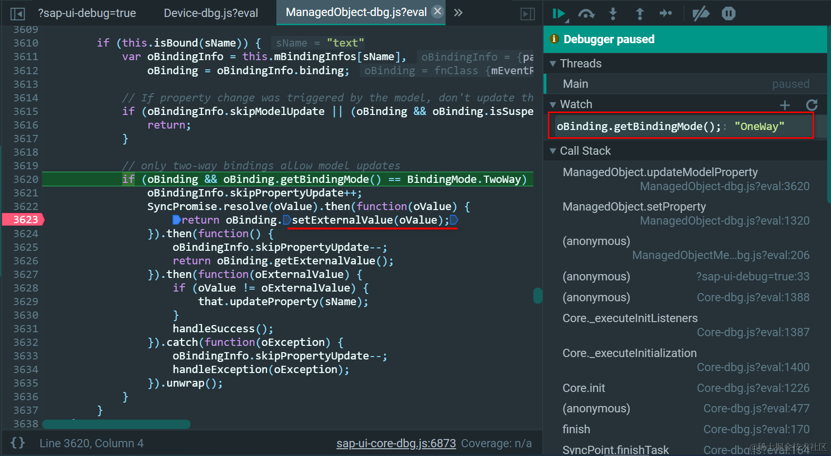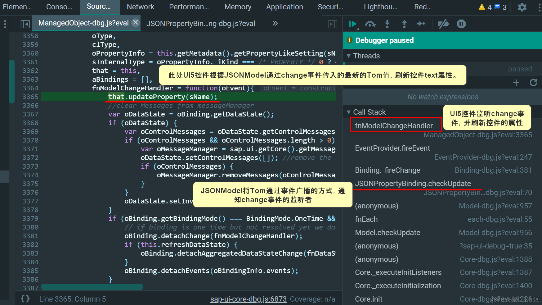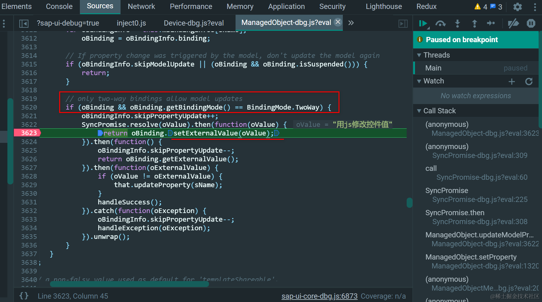 此时,控件text属性通过setText的修改,不会再触发JSONModel模型字段的变化,因为下图3620行IF语句的条件不再成立。这就是SAP UI5单向数据绑定的原理:数据仅仅会在模型字段到控件属性这个方向上单向流动。JSONModel字段值发生变化后,控件对应属性会自动更新。反之,控件属性通过API被修改时,不会引起JSONModel字段值的更新。