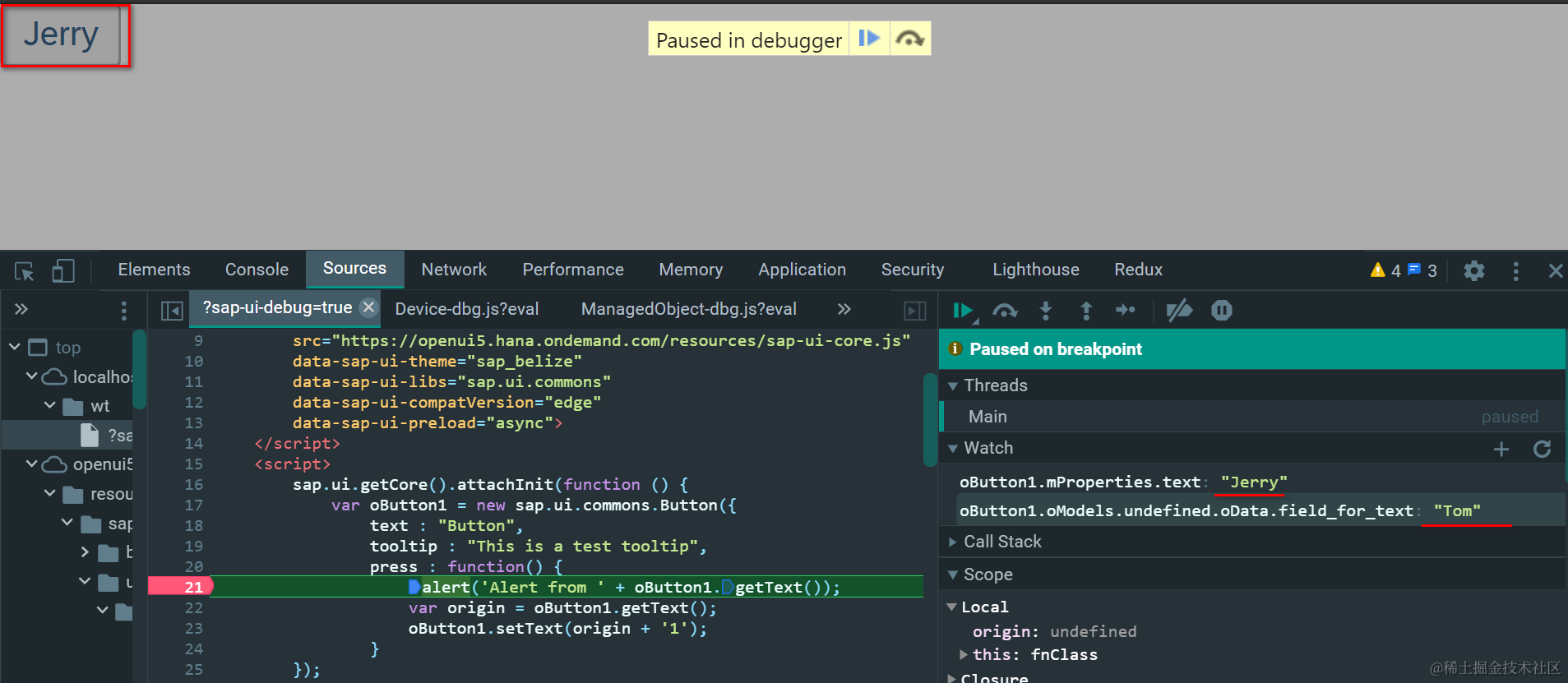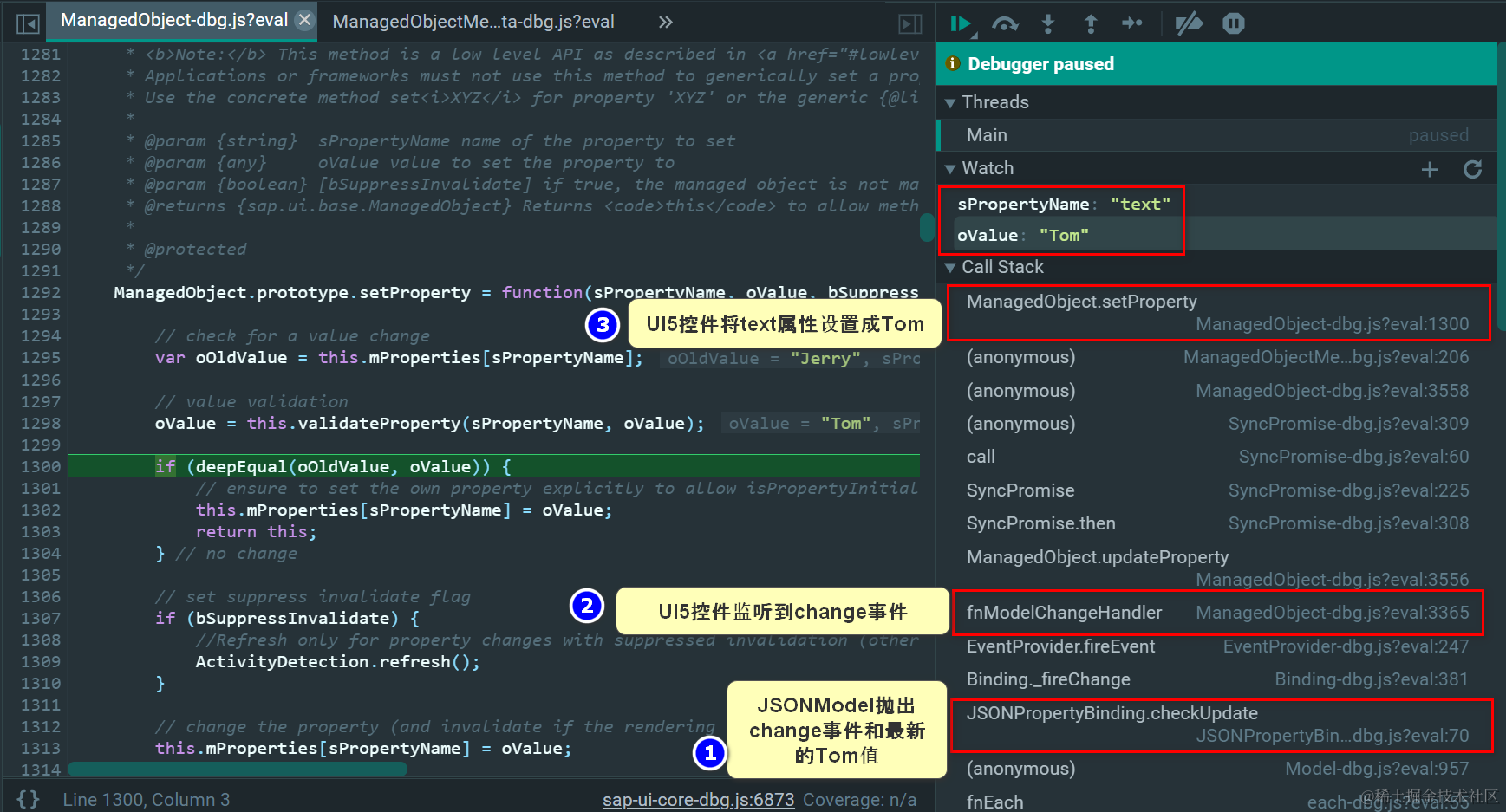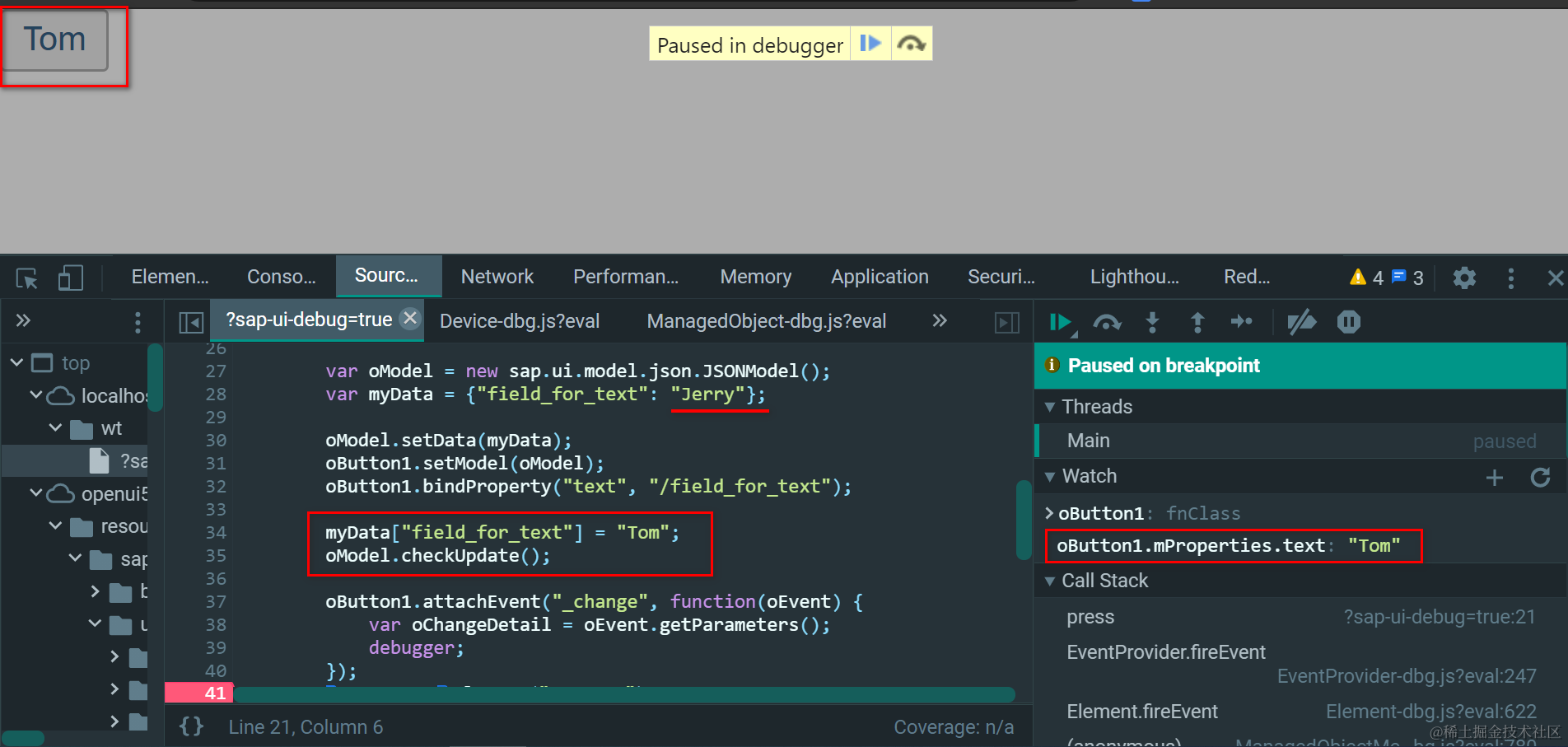 that.updateProperty最后会调用SAP UI5控件的setProperty方法,把text属性的值赋成Tom.