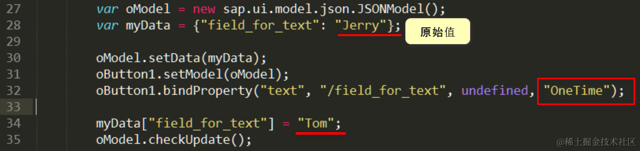 测试发现,在单次绑定模式下,SAP UI5控件属性和模型字段的自动同步已经中断了——button控件的text属性,保存的是调用bindProperty方法那一刻,JSONModel的field_for_text值Jerry,而不是数据绑定之后,修改成的最新值Tom.