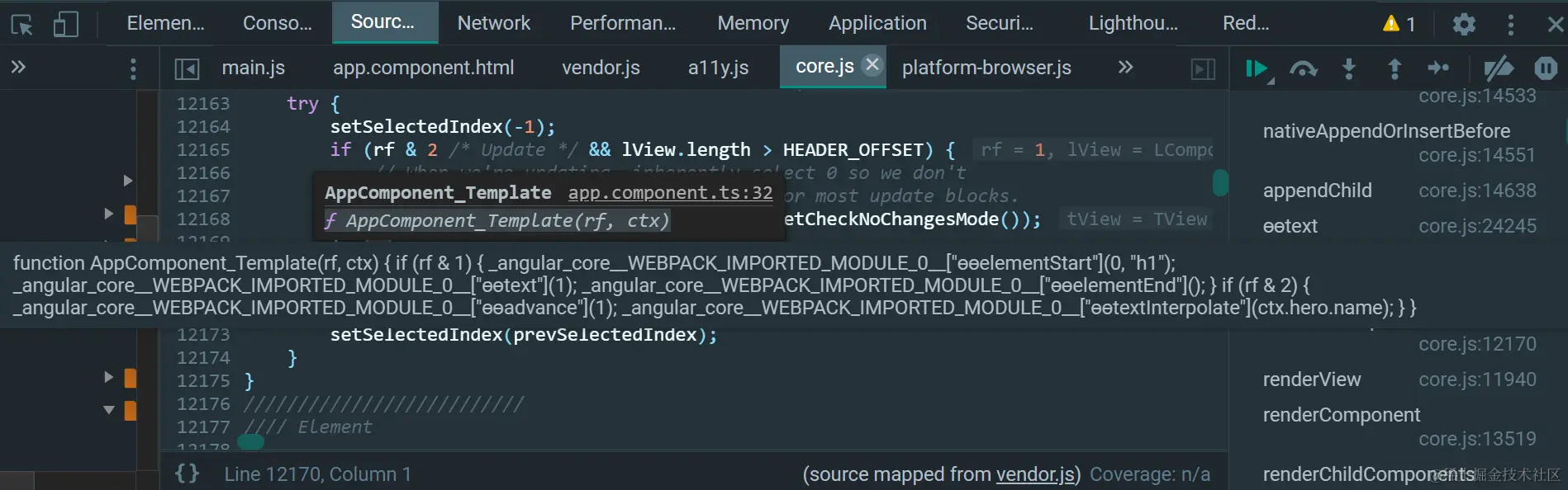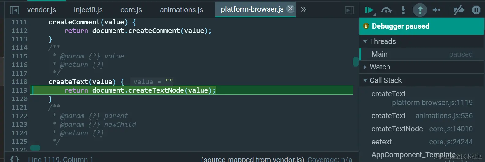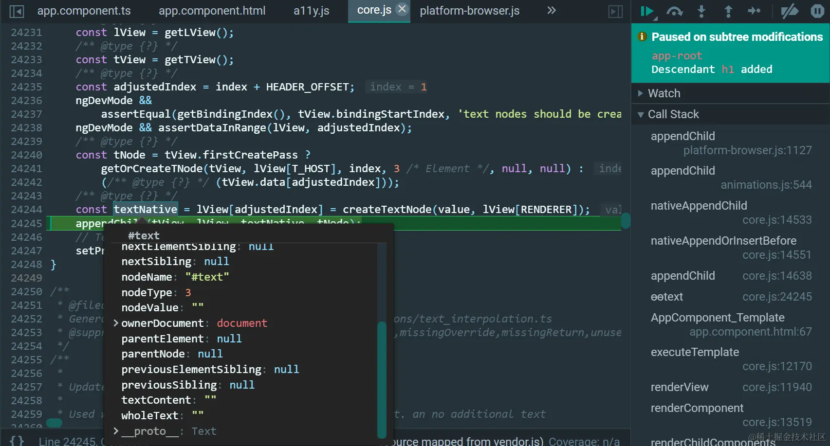 原生text节点创建好之后,platform-browser.js里,调用原生的HTML DOM的appendChild方法,将创建好的text节点,插入到DOM tree里: