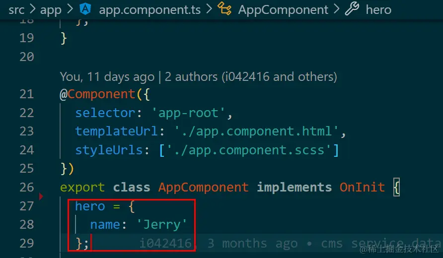 新建一个Component,只包含一个名为hero的属性,包含一个name字段,值为Jerry: