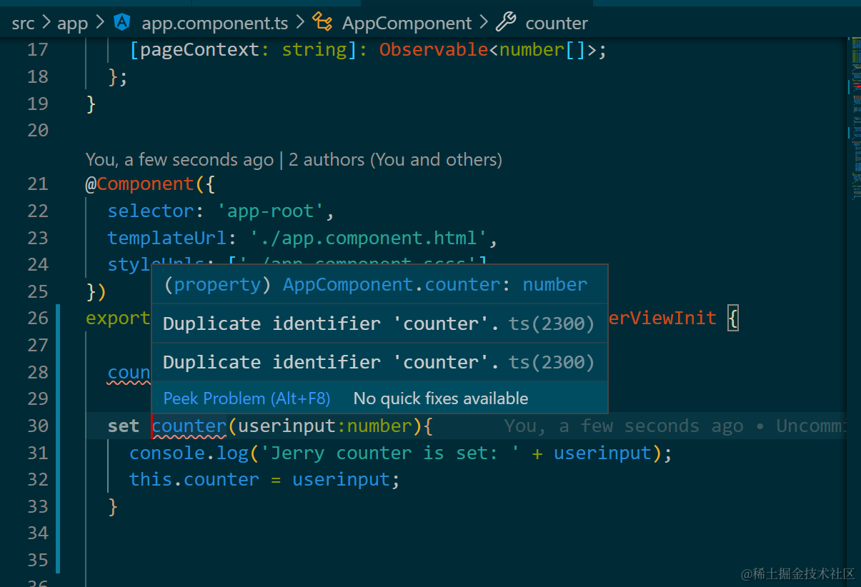 Angular set函数和Component属性的命名冲突问题 已注销 2021-04-26 74 阅读1分钟 set函数和Component属性名称不能重复,可以把Component属性加上下划线,暗示其是私有属性,然后通过公有的set来管理。 更多Jerry的原创文章,尽在:“汪子熙”: