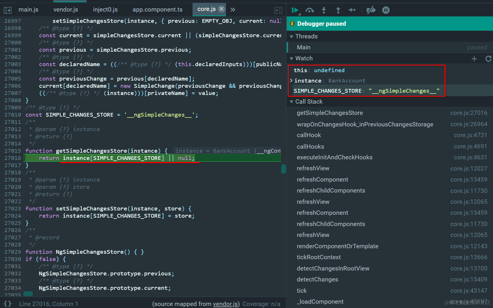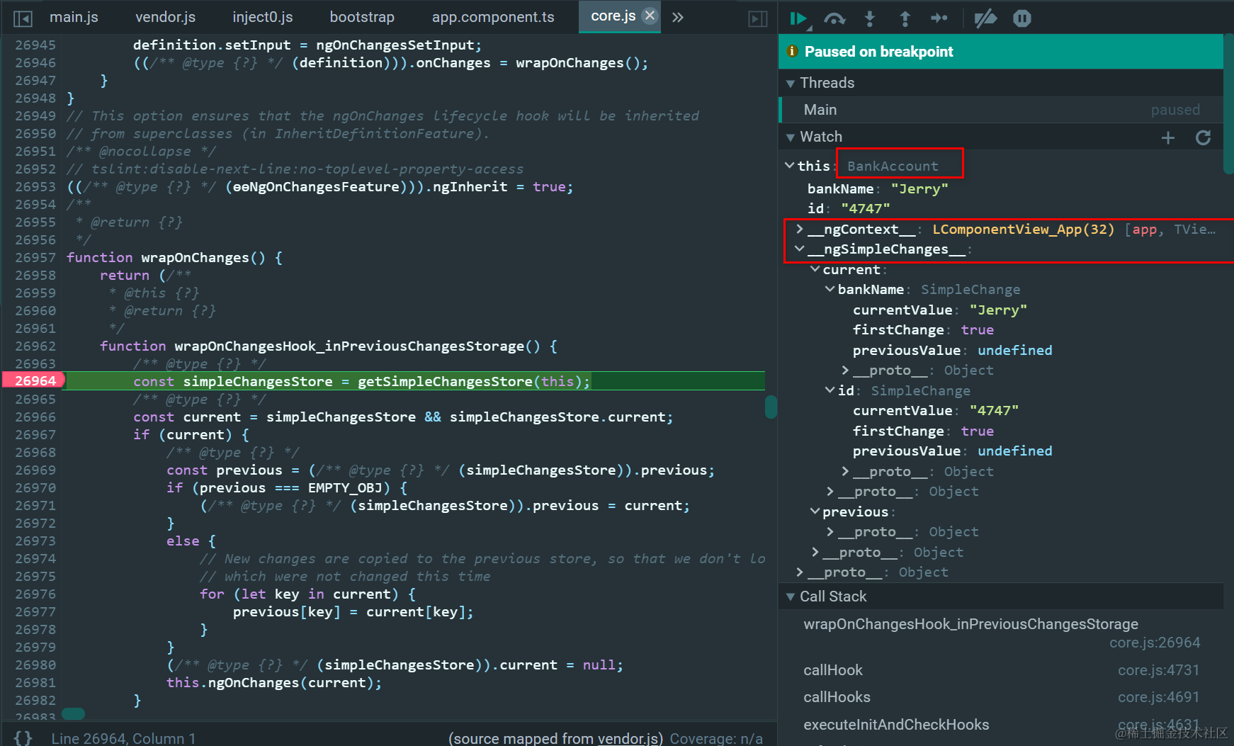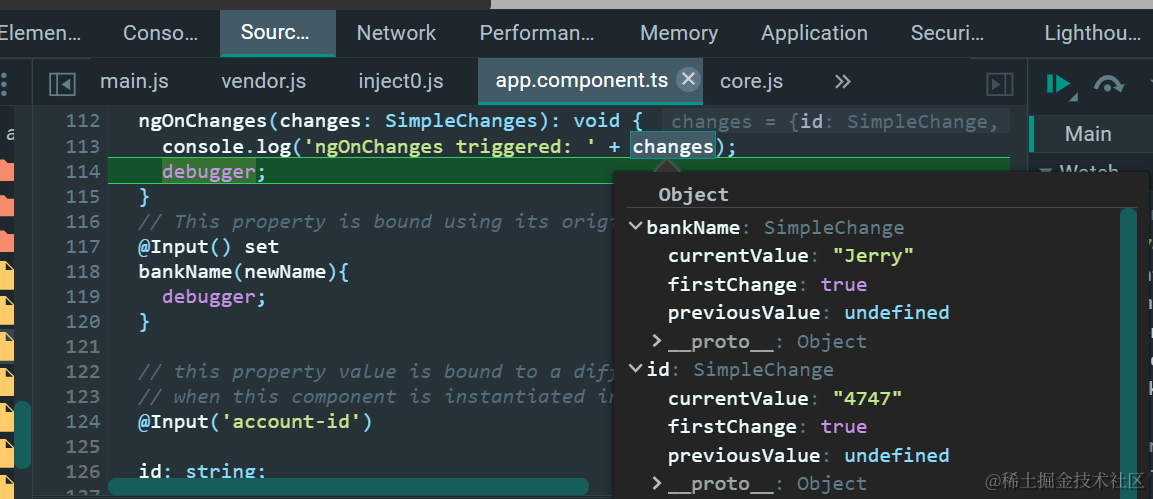 Angular getSimpleChangesStore的实现原理 已注销 2021-04-26 165 阅读1分钟 父组件的ngOnInit钩子里,并没有SimpleChanges相关的数据结构: 而子组件就不一样了: 直接从Component实例的__ngSimpleChanges__字段里读取数据: 更多Jerry的原创文章,尽在:“汪子熙”: