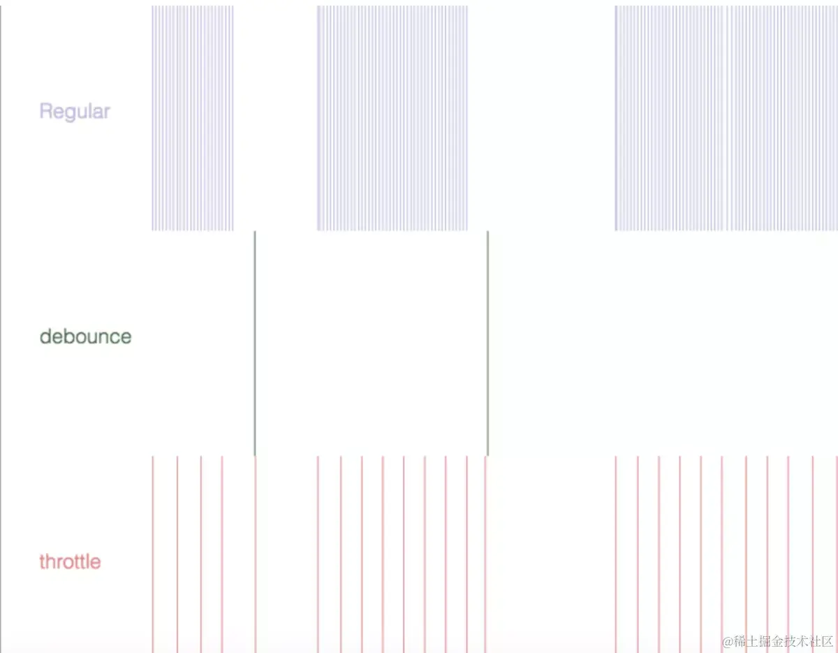 假设我们把用户在Account字段的每一次输入事件,触发的事件处理函数的执行,用一根竖线表示。则未经任何处理的原始场景,用函数节流和函数防抖重新实现的场景,三者比较的示意图如下: