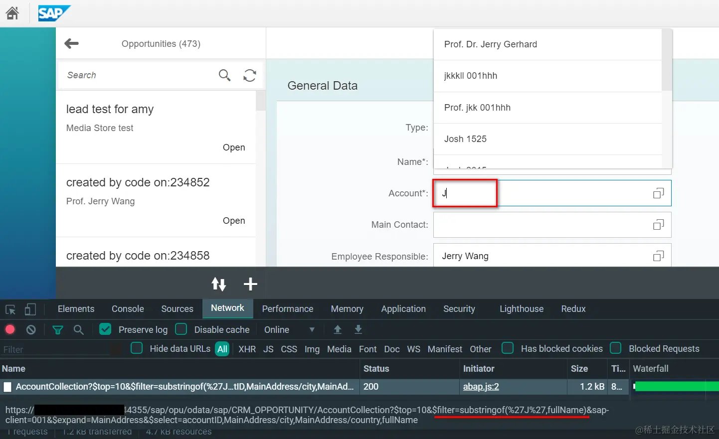 My Opportunities是SAP成都研究院CRM Fiori开发团队于2014年到2016年之间,负责的CRM Fiori应用之一。用户在创建Opportunity时,需要指定Account字段,该字段支持Live Search功能,比如敲入一个字符"J", UI5会发送一个OData请求到后台,后者异步返回Account模型里fullname字段包含J的那些数据,作为搜索结果,通过下拉列表的方式显示在UI上: