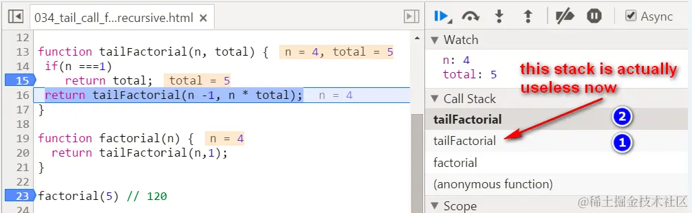 n = 1,total = 120,终于计算结束了!这就是5的阶乘,如何通过尾递归的方式计算出来的全过程。