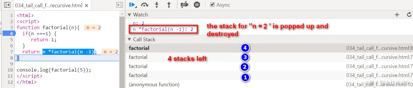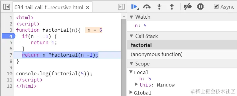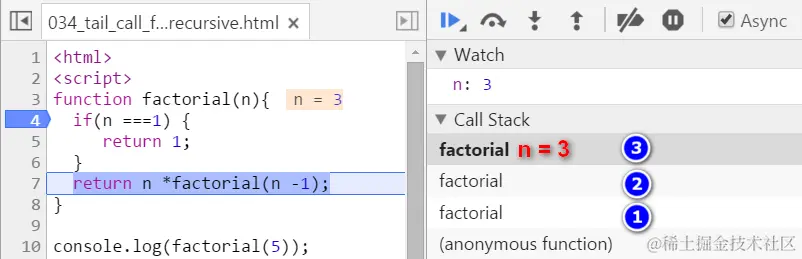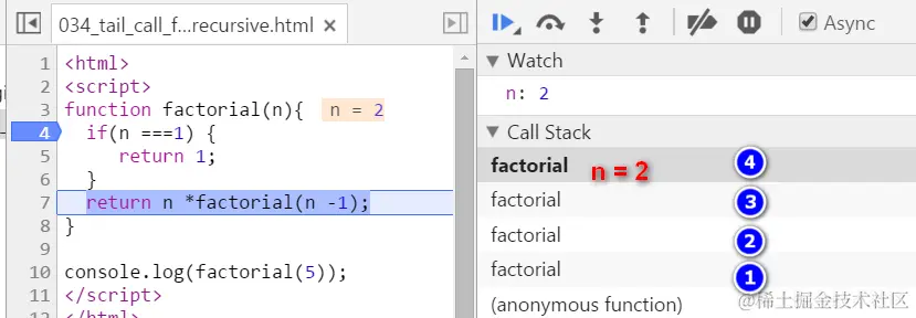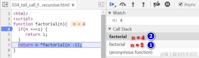 注意观察下图的Call Stack列表,此时我们已经有两个factorial函数的调用栈帧了。