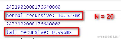 一个实际的性能比较例子:计算20的阶乘,二者的性能有巨大差异:普通递归实现需要10毫秒,而尾递归实现仅仅需要不到1毫秒的时间。