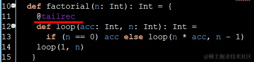应用开发人员通过Scala提供的@tailrec注解,告诉编译器,对注解修饰的方法进行尾递归优化: