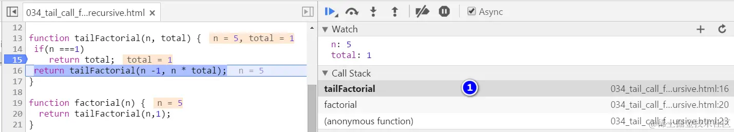 下图第20行语句是以尾递归方式计算5的阶乘入口,调用尾递归函数tailFactorial,注意函数的第二个输入参数total,这个参数用于存储当前阶乘的计算结果。