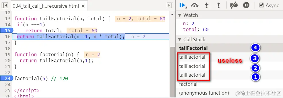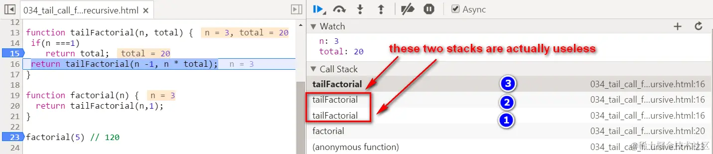 因为按照尾递归版本的阶乘实现,每一轮阶乘的递归计算结果,已经通过第二个参数total保存了下来,因此没有必要再用一个完整的栈帧,去保存当前这轮递归计算的函数调用上下文了。这就引出了所谓“尾递归优化”的概念: