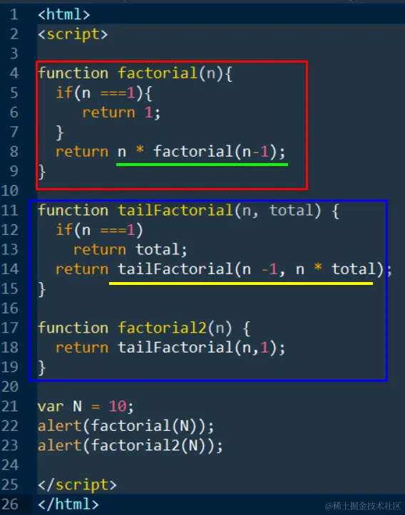 下图红色区域内是阶乘算法的常规递归实现,蓝色区域是阶乘算法的尾递归实现版本。在常规递归算法的末尾,第8行语句(绿色),除了递归调用factorial函数外,还包含一个同n的乘法操作,所以整个函数factorial不能算作尾递归函数。