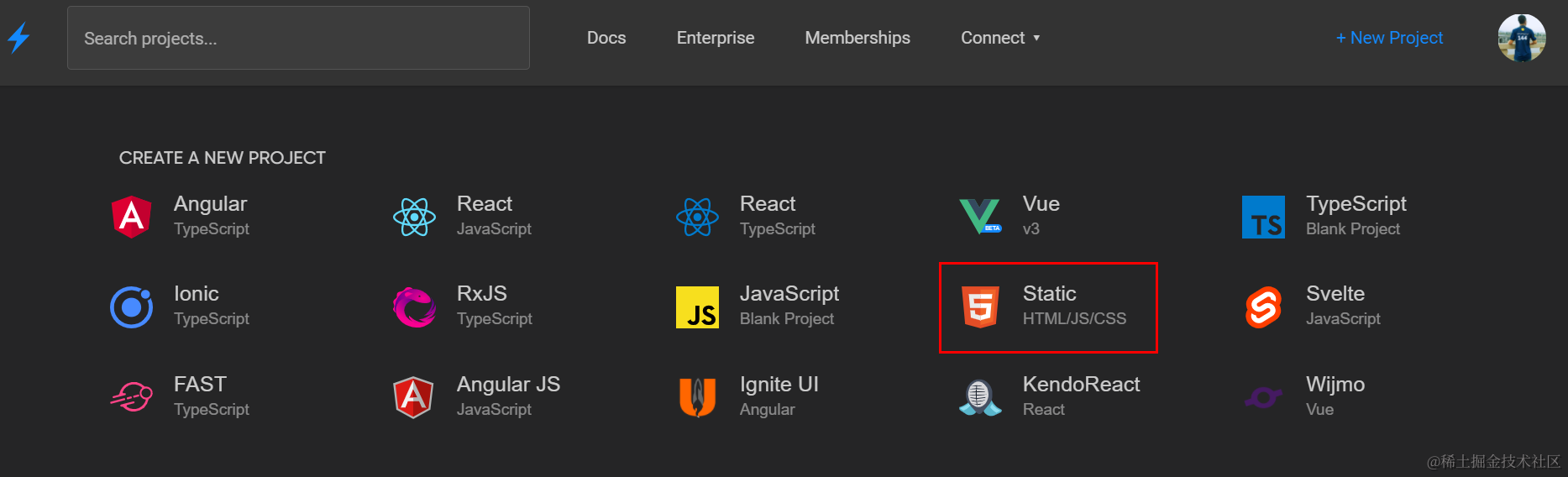 StackBlitz 中新建一个基于 HTML/JS/CSS 的 Static 项目: