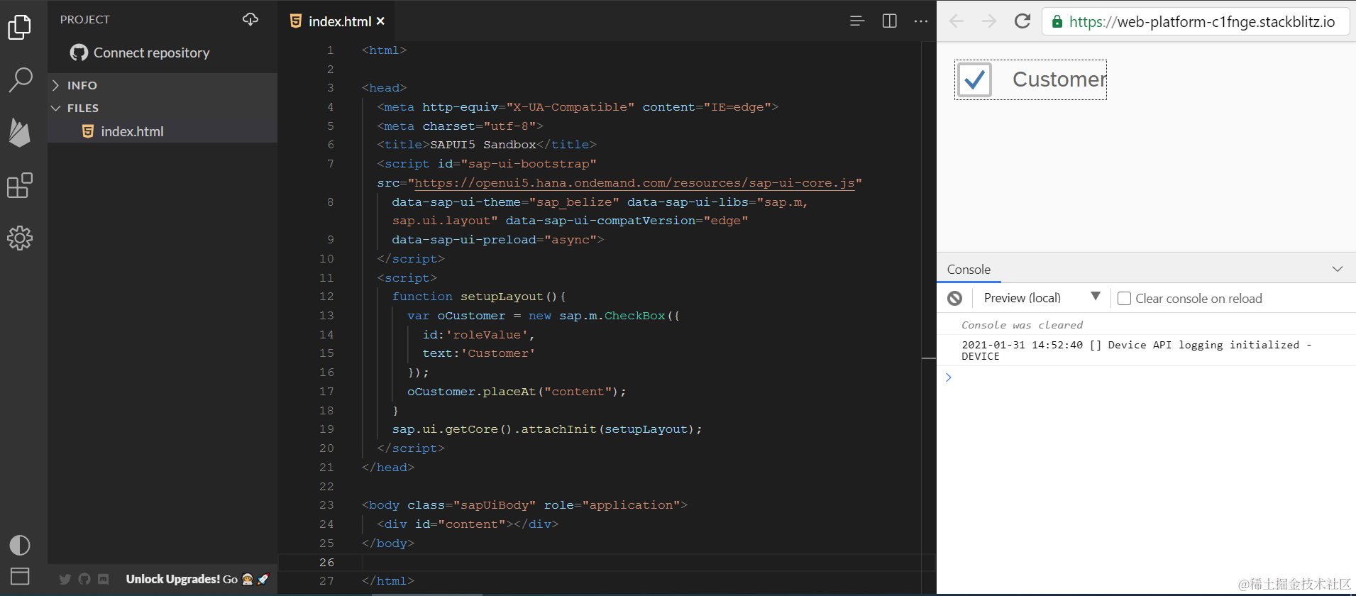 StackBlitz 能否作为 SAP UI5 开发的在线 IDE 呢?Jerry 简单试了试,虽然 StackBlitz 无法像原生支持 Angular,React 和 Vue 那样支持 SAP UI5,但仍然可以用来做一些简单的 SAP UI5 应用的验证工作,比如测试某些 SAP UI5 控件的行为。