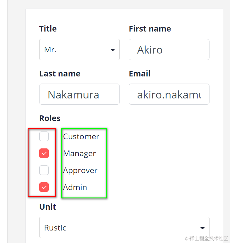 下图是 SAP Spartacus 用户编辑页面,每个用户可以分配若干个角色,除了点击下图红色每种角色对应的圆角正方形框之外,点击绿色的文本框,也需要能选中对应的角色。