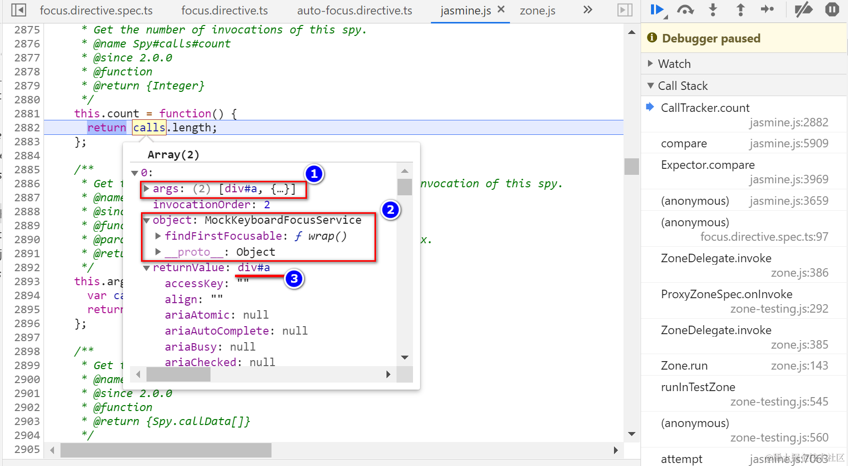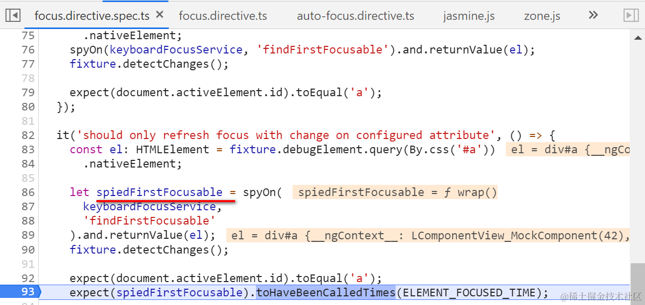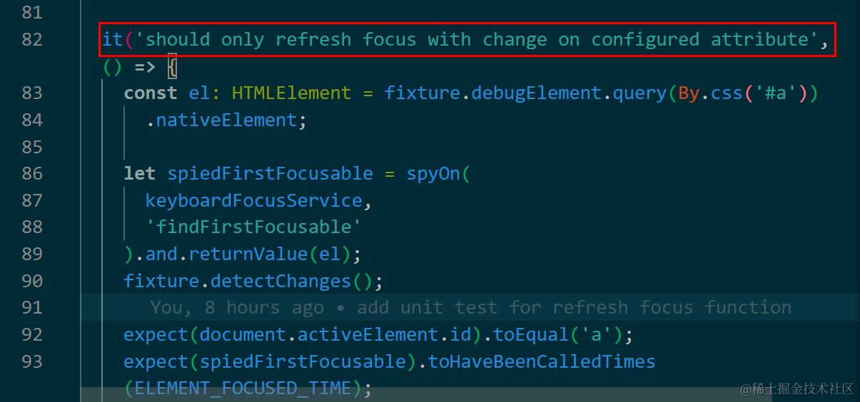 spiedFirstFocusable是spyOn方法针对实例keyboardFocusService的findFirstFocusable方法进行监控后返回的句柄。借助该句柄,我们可以使用toHaveBeenCalledTimes方法,得到其在单元测试过程中实际调用的次数。