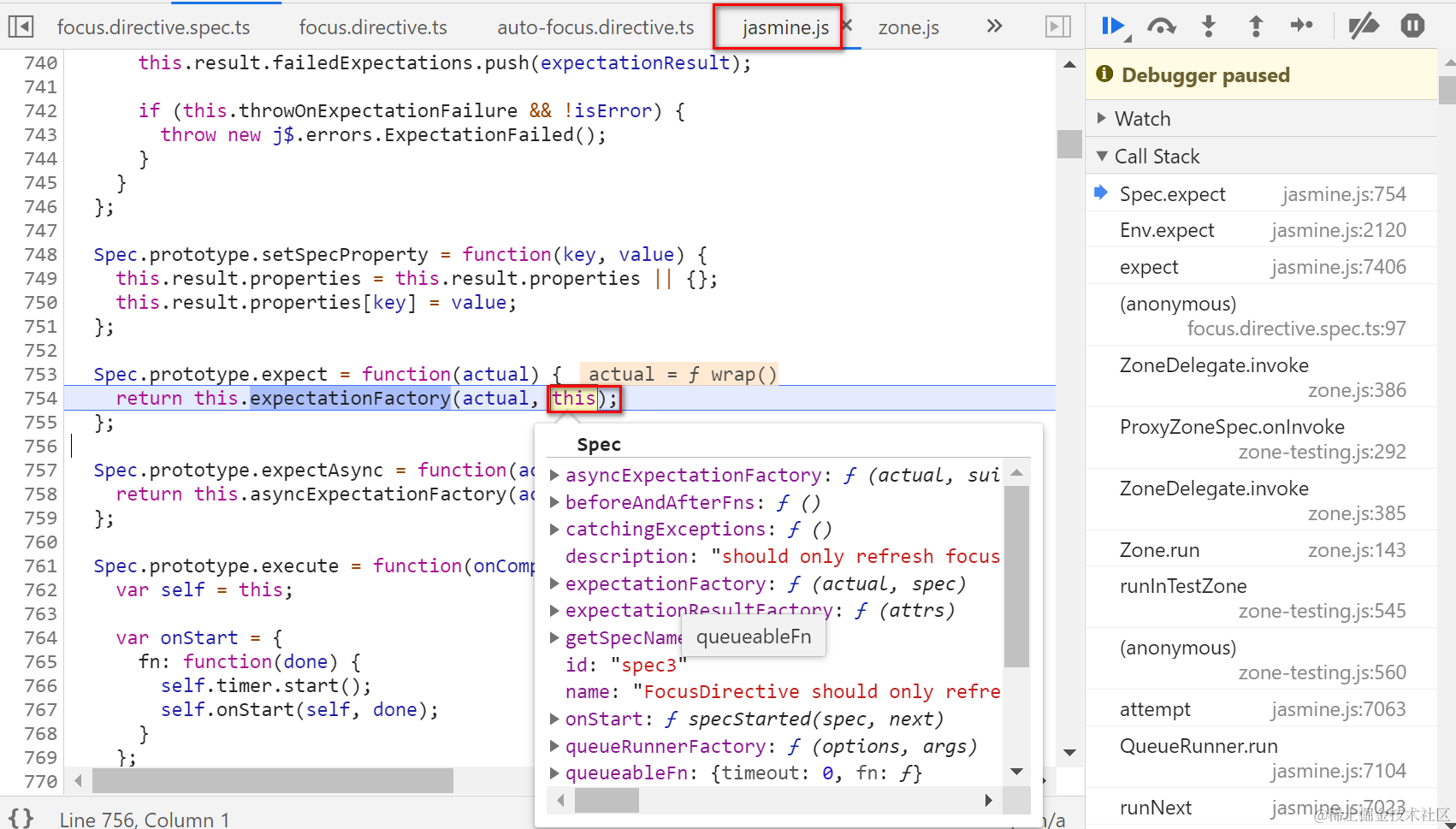 第二个参数为单元测试代码运行的spec信息,即下图高亮代码: